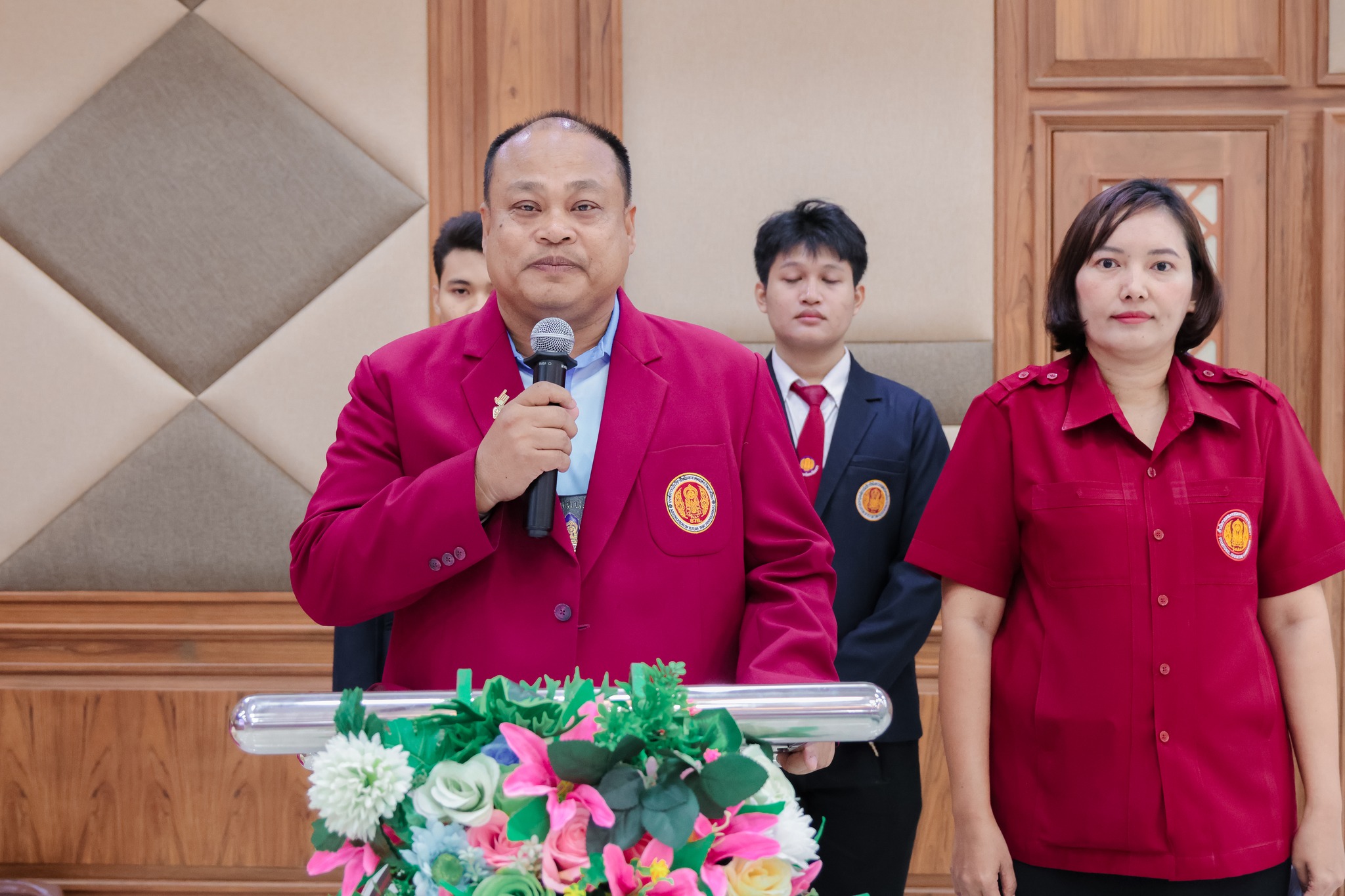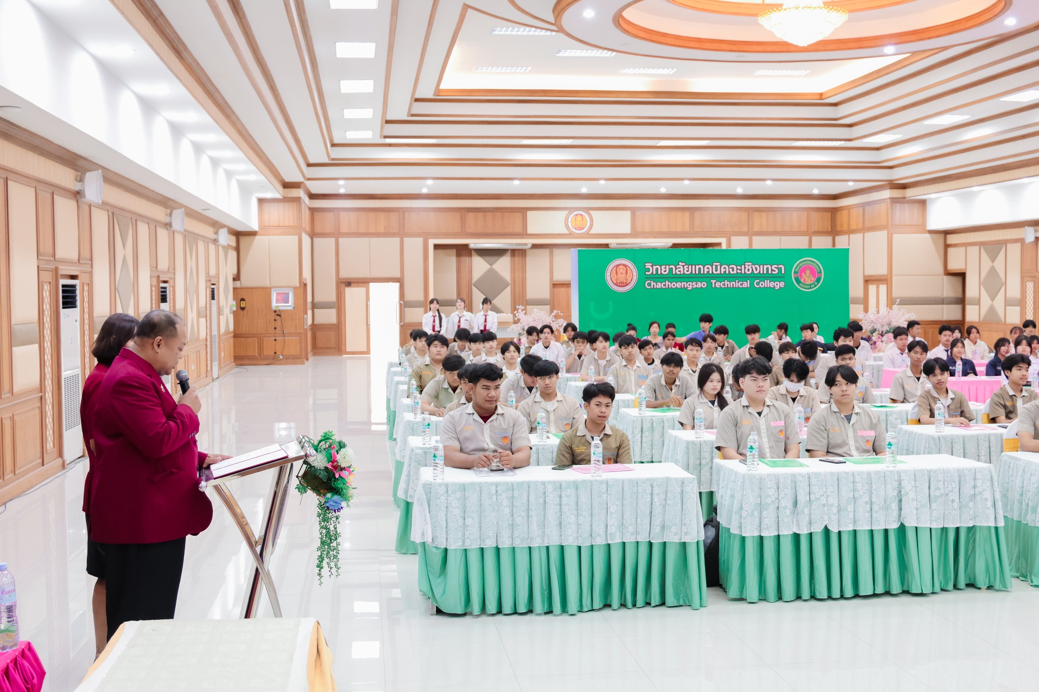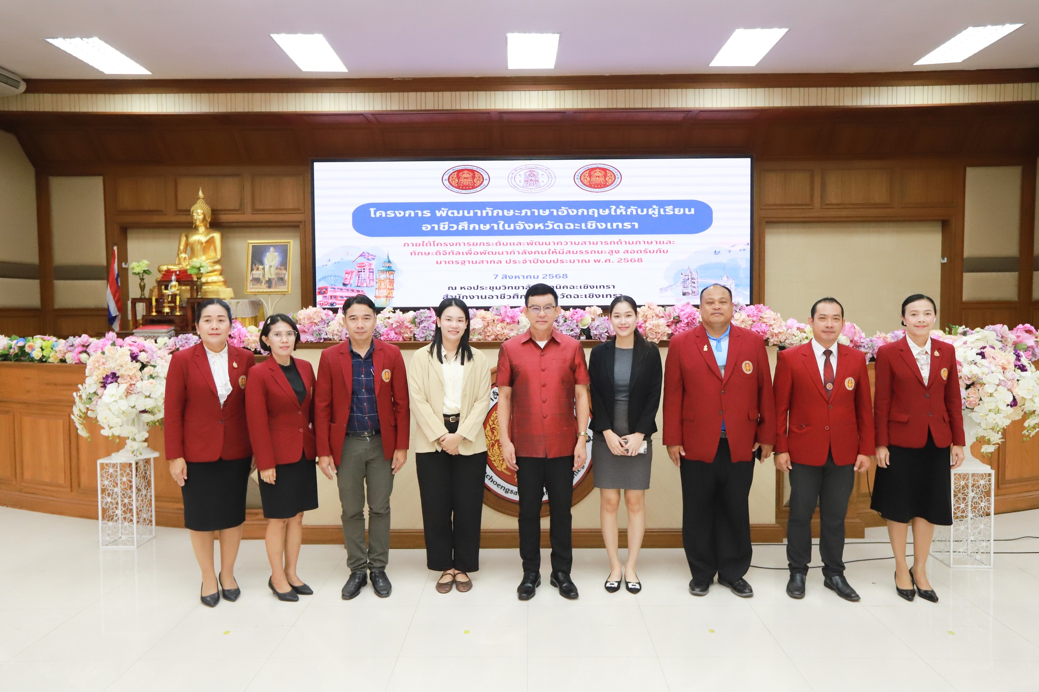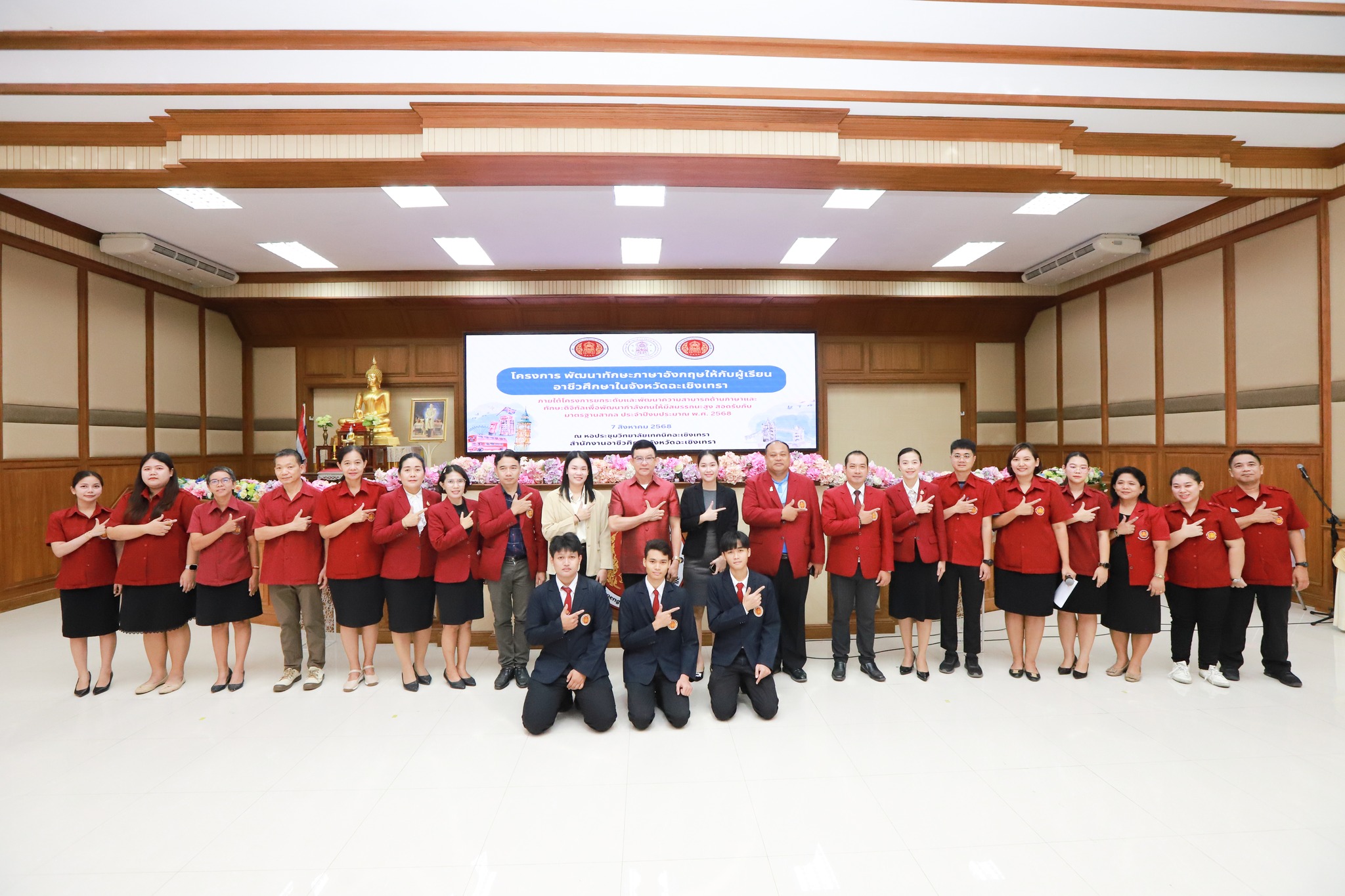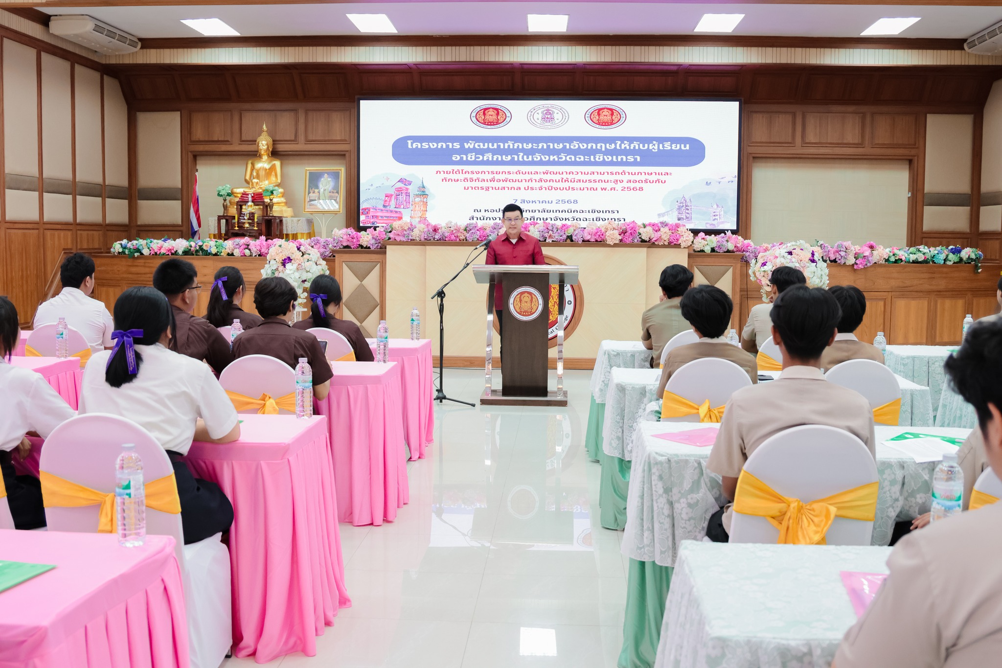 ว่าที่พันตรี ดร.วัชรพล ลักษณลม้าย ผู้อำนวยการ (วิทยฐานะเชี่ยวชาญ) วิทยาลัยเทคนิคฉะเชิงเทรา -ผู้อำนวยการสำนักงานอาชีวศึกษาจังหวัดฉะเชิงเทรา ได้มอบหมายให้ ดร.สุพจน์ ทองเหลือง ผู้อำนวยการ (วิทยฐานะเชี่ยวชาญ) วิทยาลัยอาชีวศึกษาฉะเชิงเทรา -รองผู้อำนวยการสำนักงานอาชีวศึกษาจังหวัดฉะเชิงเทรา เป็นประธานในพิธีเปิดโครงการ “พัฒนาทักษะภาษาอังกฤษ ให้กับผู้เรียนอาชีวศึกษาในจังหวัดฉะเชิงเทรา ภายใต้โครงการยกระดับและพัฒนาความสามารถด้านภาษาแบะทักษะดิจิทัล เพื่อพัฒนากำลังคนให้มีสมรรถนะสูงสอดรับกับมาตรฐานสากล ประจำปีงบประมาณ พ.ศ. 2568 “ พร้อมด้วยคณะผู้บริหาร คณะครูและนักเรียนระดับ ปวช.ในสังกัด สอจ.ฉะเชิงเทรา เข้าร่วมจำนวน 100 คน ในวันพฤหัสบดี ที่ 7 สิงหาคม 2568 ณ หอประชุมวิทยาลัยเทคนิคฉะเชิงเทรา