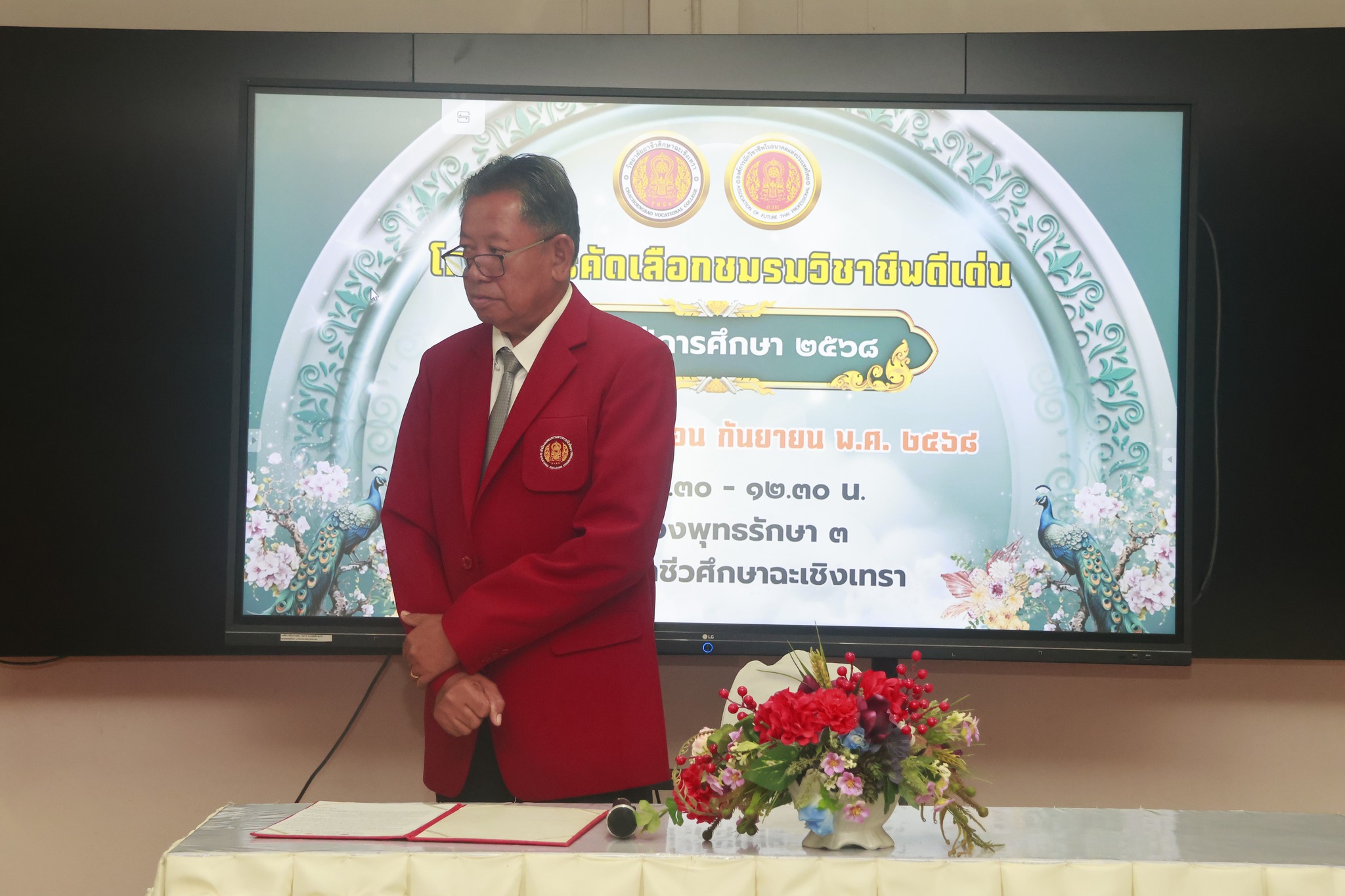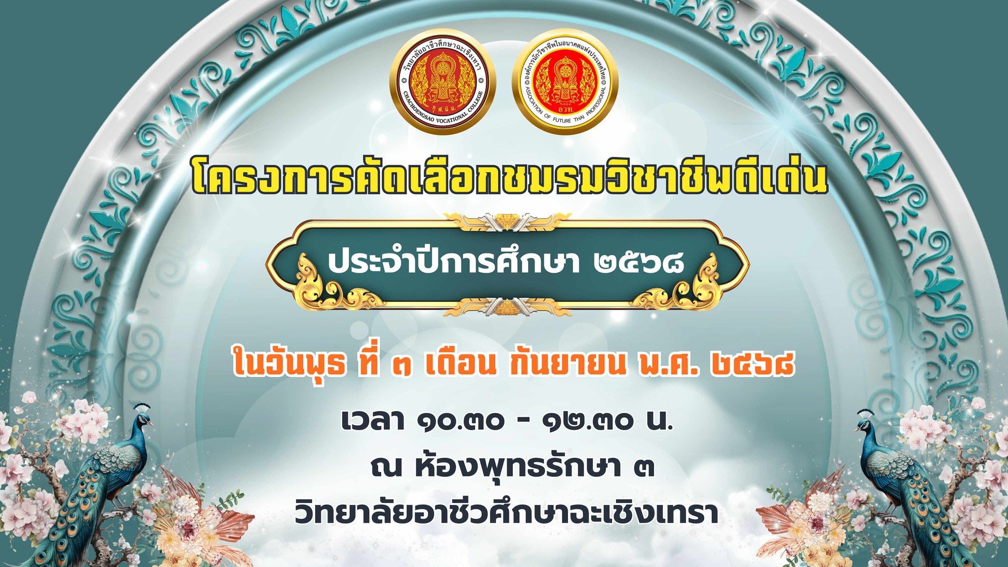 ดร.สุพจน์ ทองเหลือง ผู้อำนวยการ (วิทยฐานะเชี่ยวชาญ) วิทยาลัยอาชีวศึกษาฉะเชิงเทรา มอบหมายให้ นายชำนาญ แสงทอง รองผู้อำนวยการ เป็นประธานในพิธีเปิดโครงการคัดเลือกชมรมวิชาชีพดีเด่น ประจำปีการศึกษา ๒๕๖๘ การคัดเลือกชมชมรมวิชาชีพ โดยการนำเสนอผลงาน และกิจกรรมของชมรมวิชาชีพแต่ละชมรม ในวันที่ ๓ กันยายน ๒๕๖๘ ณ ห้องพุทธรักษา ๓ วิทยาลัยอาชีวศึกษาฉะเชิงเทรา