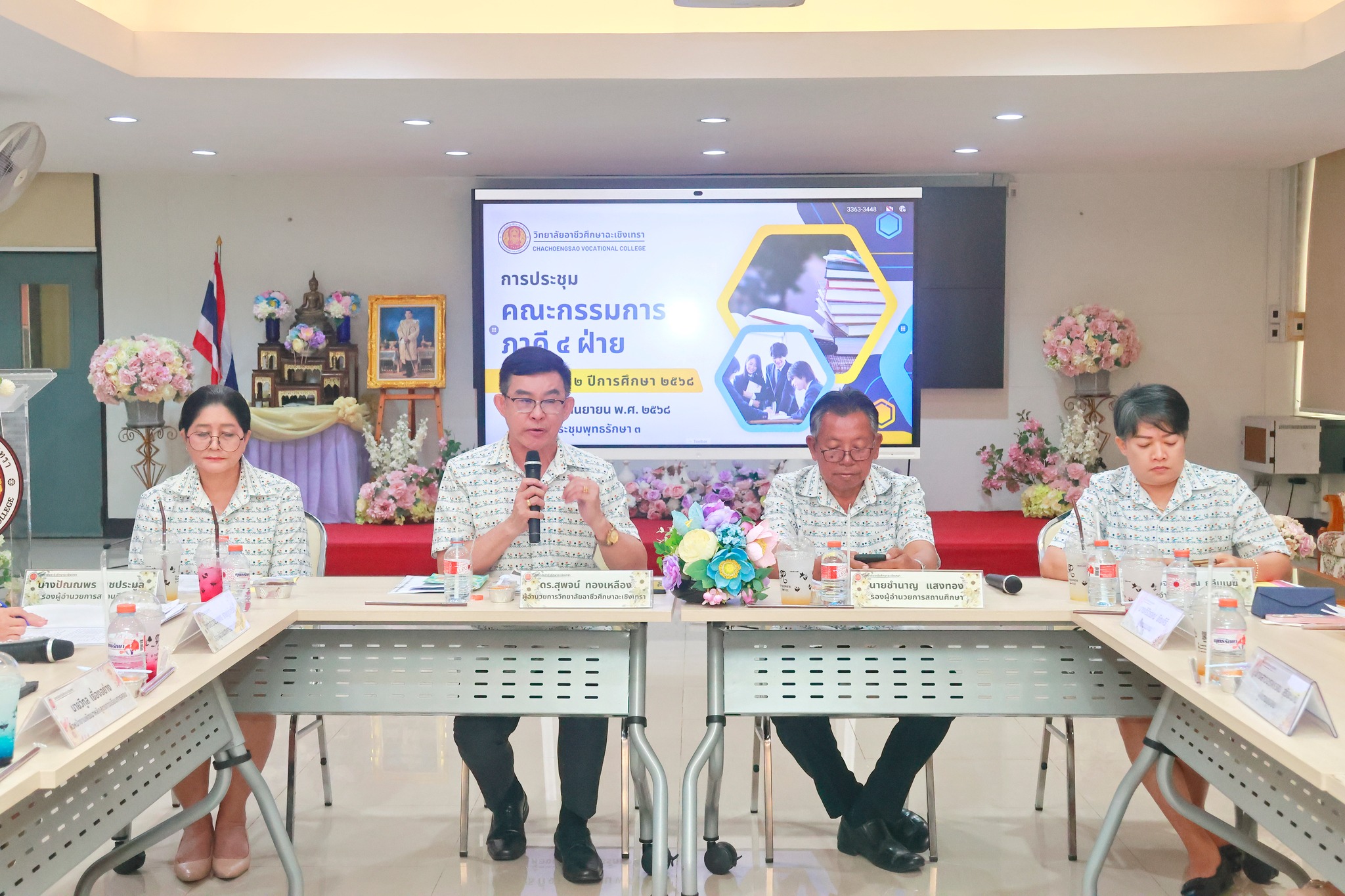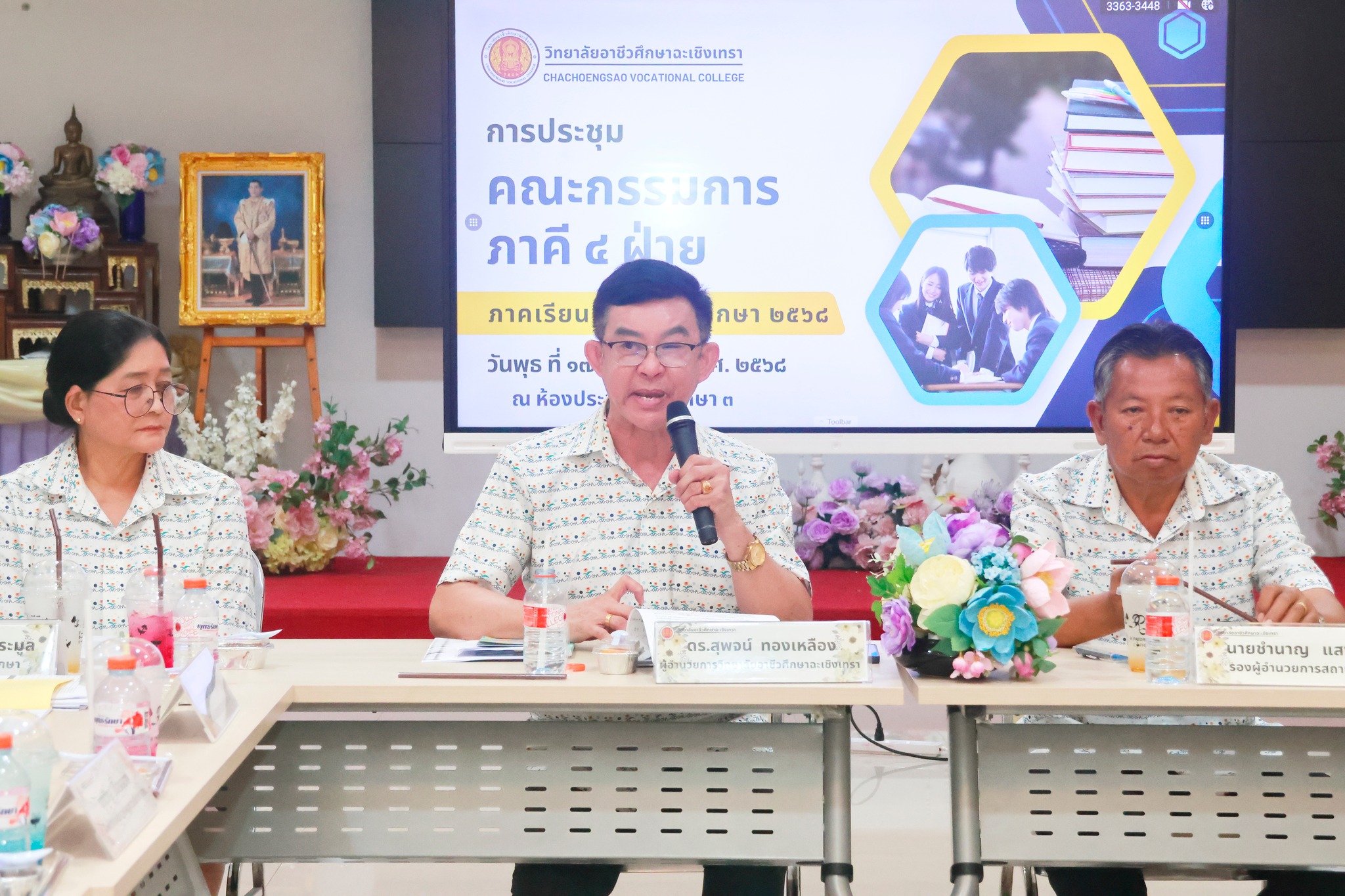 ดร.สุพจน์ ทองเหลือง ผู้อำนวยการ (วิทยฐานะเชี่ยวชาญ) วิทยาลัยอาชีวศึกษาฉะเชิงเทรา พร้อมด้วยคณะผู้บริหาร คณะกรรมการบริหารสถานศึกษา ผู้แทนครู ผู้แทนผู้ปกครอง ผู้แทนชุมชน ผู้แทนนักเรียน เข้าร่วมการประชุมภาคี ๔ ฝ่าย ภาคเรียนที่ ๒ ปีการศึกษาา ๒๕๖๘ เพื่อพิจารณากลั่นกรองและคัดเลือกรายการหนังสือเรียน ในวันที่ ๑๗ กันยายน พ.ศ. ๒๕๖๘ ณ ห้องประชุมพุทธรักษา ๓
