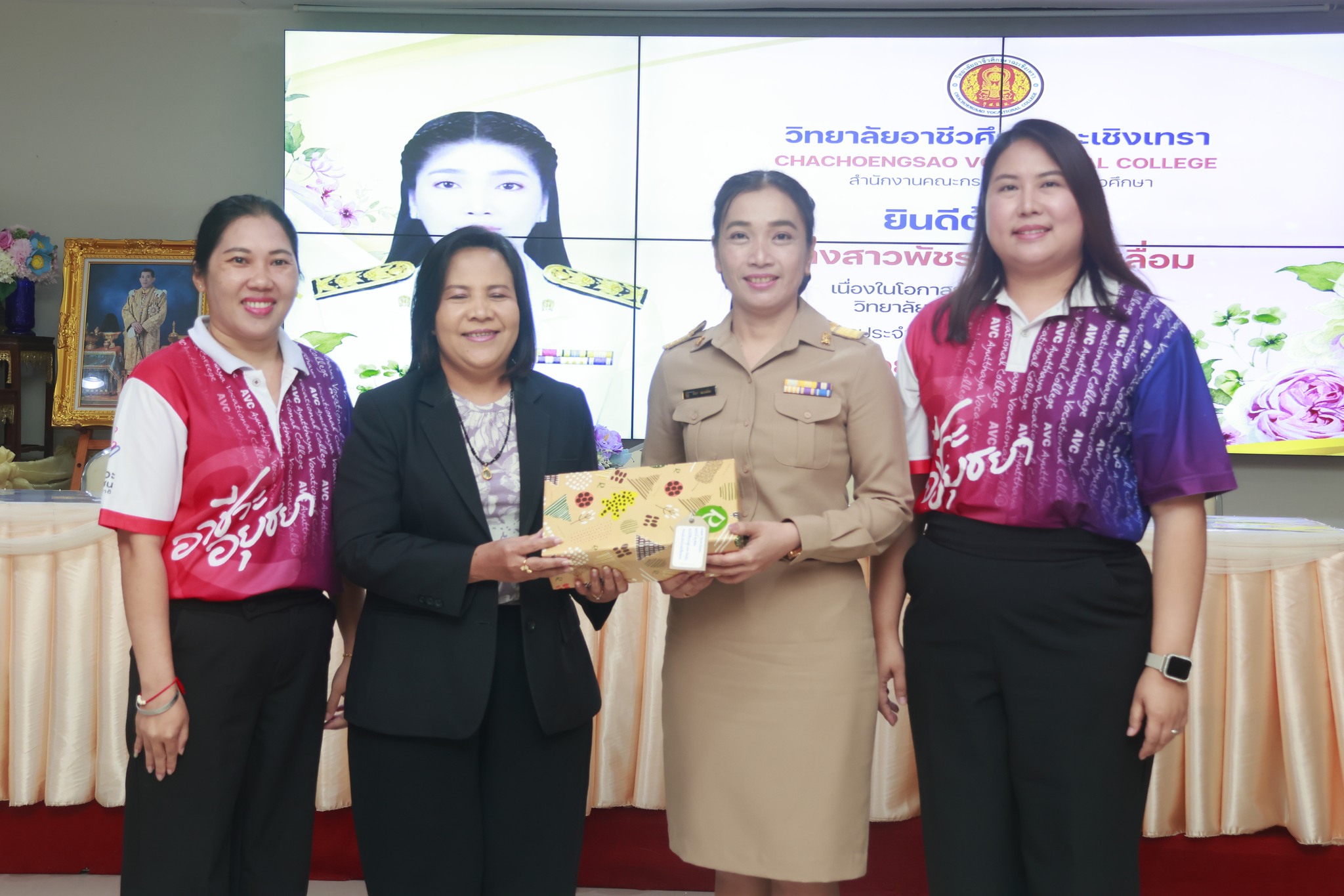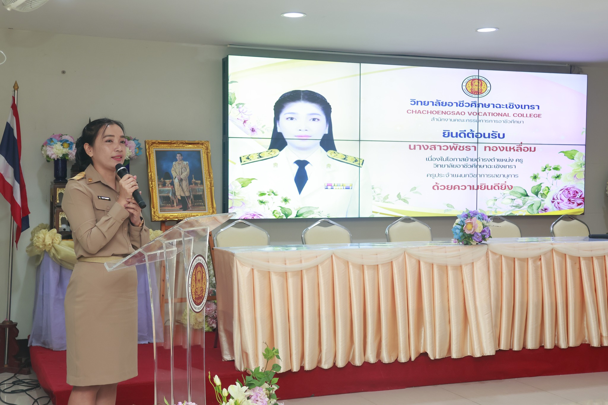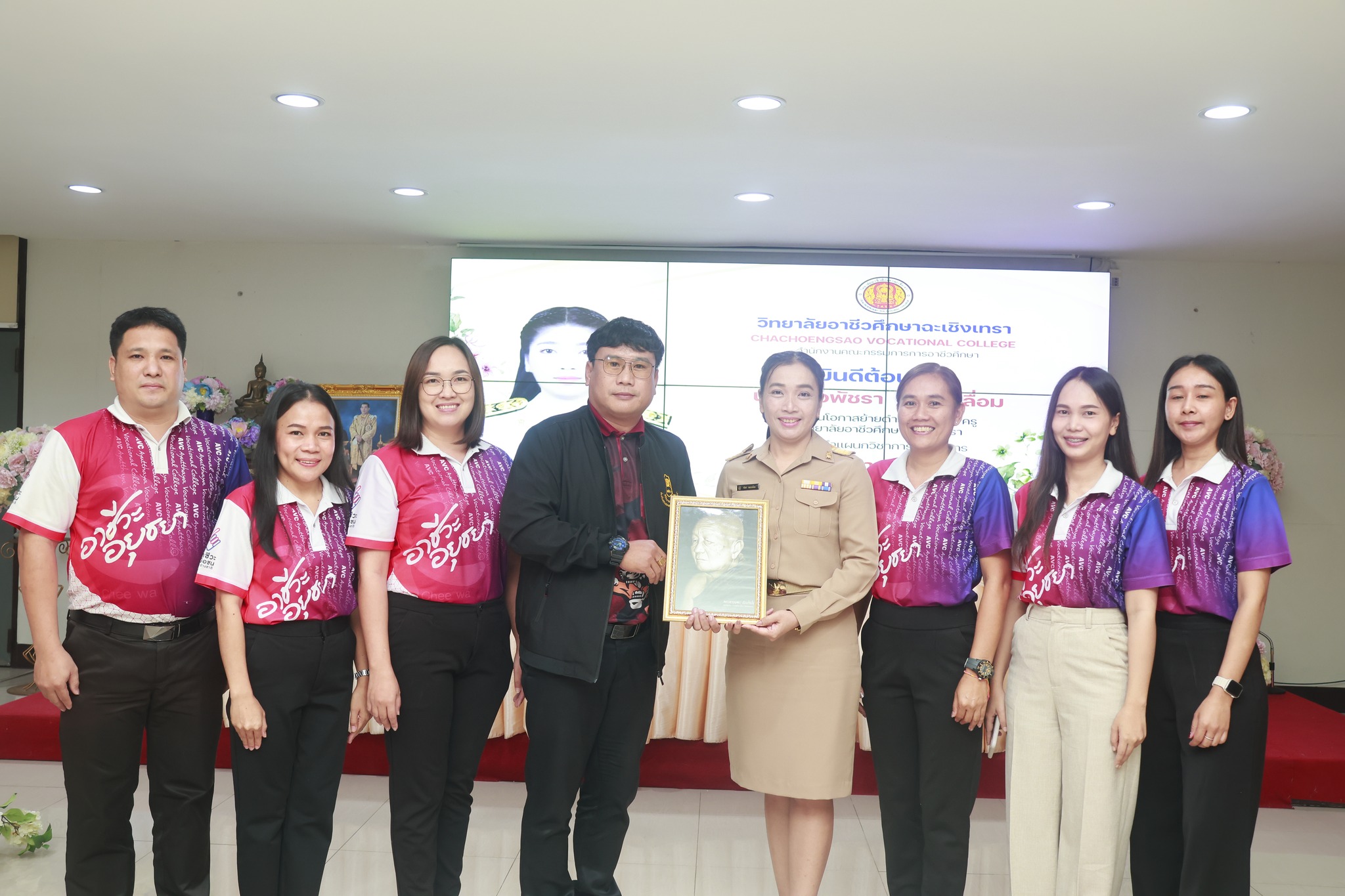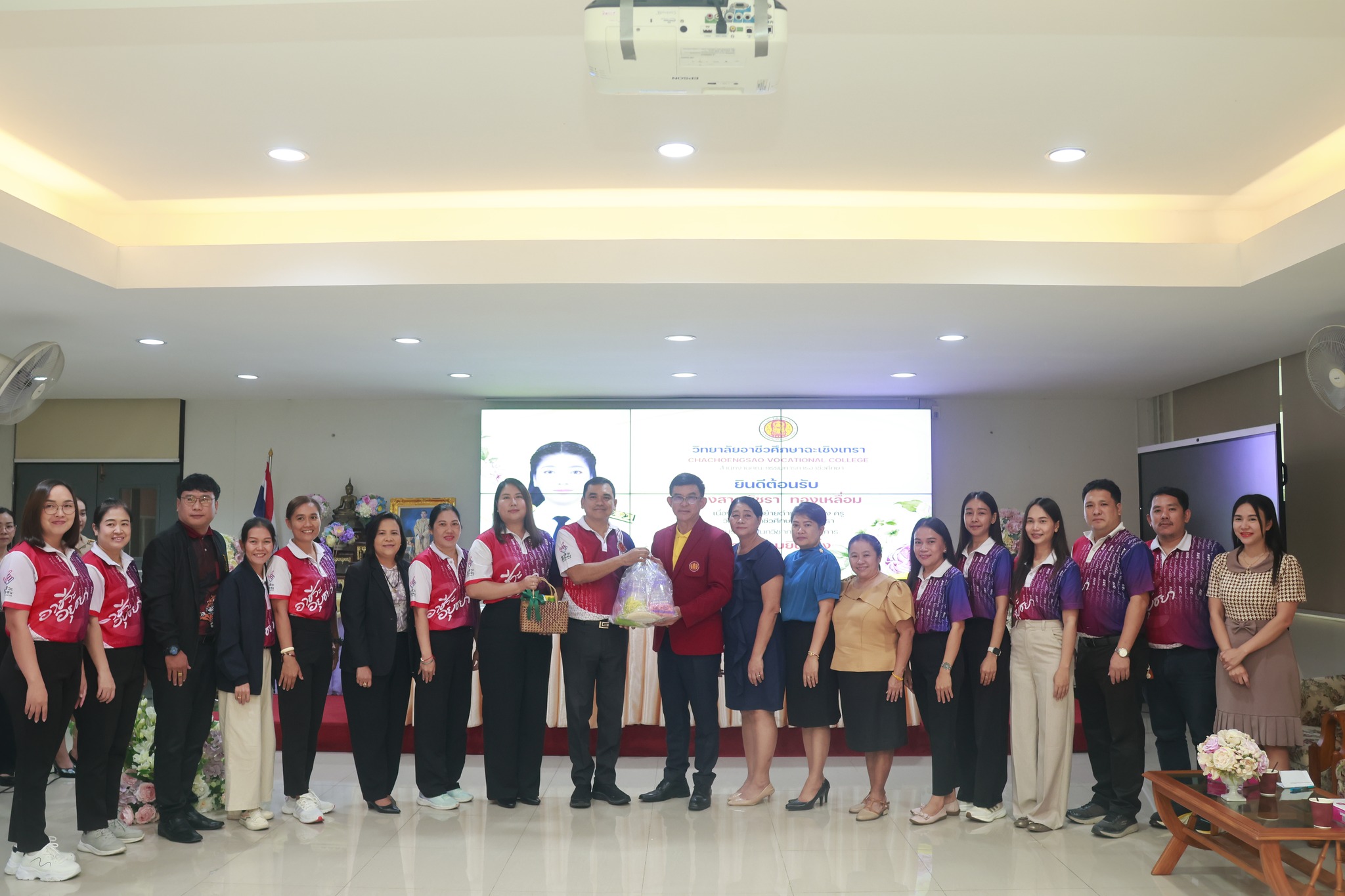ดร.สุพจน์ ทองเหลือง ผู้อำนวยการ (วิทยฐานะเชี่ยวชาญ) วิทยาลัยอาชีวศึกษาฉะเชิงเทรา พร้อมด้วยคณะผู้บริหาร ครู และบุคลากรทางการศึกษา ร่วมแสดงความยินดีและต้อนรับ นางสาวพัชรา ทองเหลื่อม เนื่องใน โอกาสย้ายดำรงตำแหน่งครู ประจำแผนกวิชาการเลขานุการ