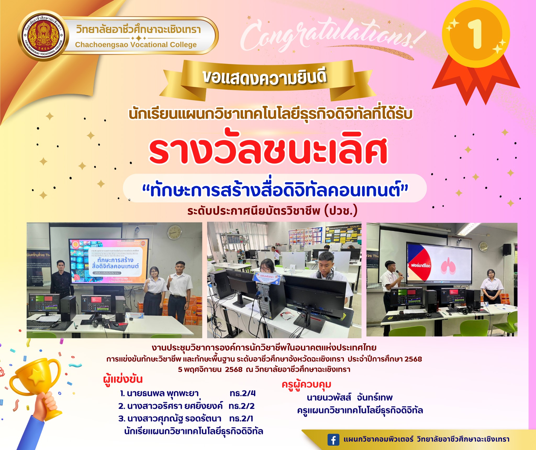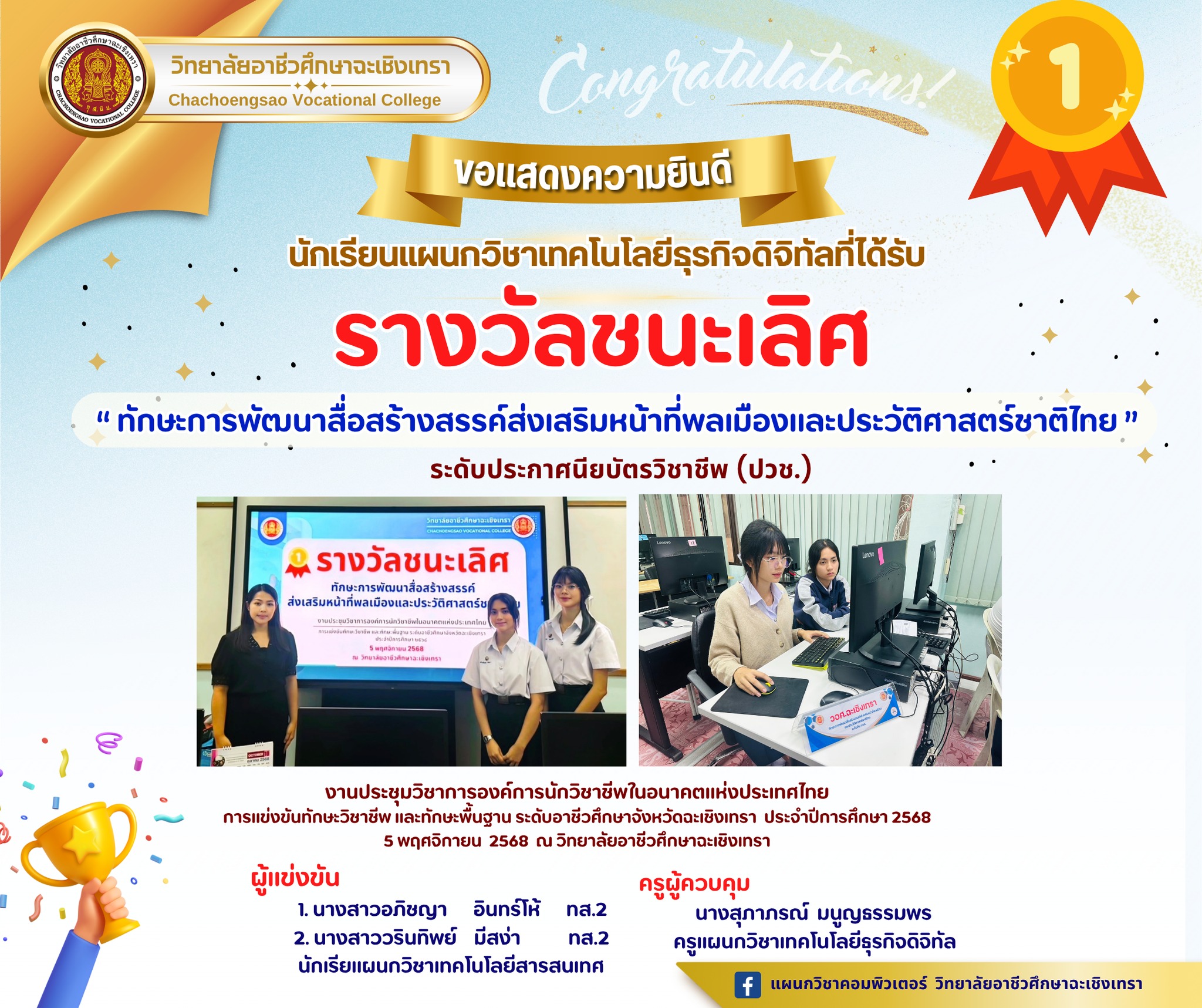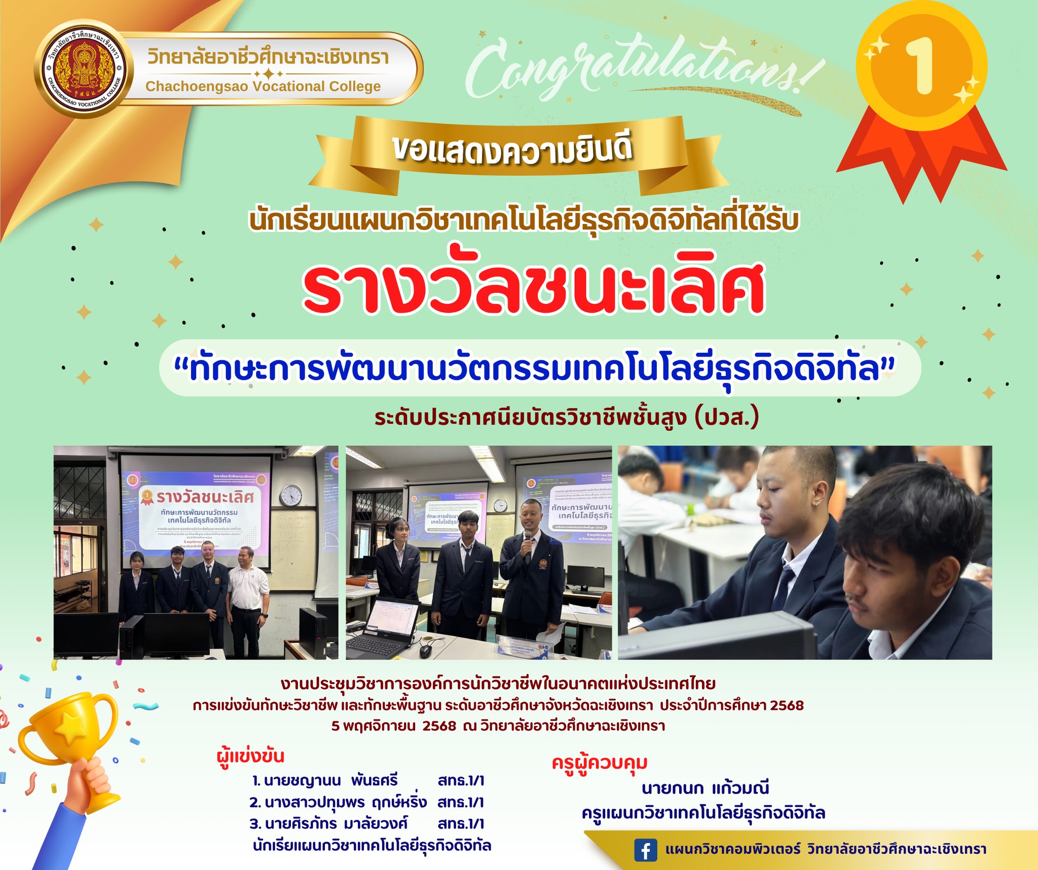 ได้รับรางวัล ชนะเลิศ การประกวดแข่งขันทักษะวิชาชีพและทักษะพื้นฐาน" ระดับอาชีวศึกษาจังหวัดฉะเชิงเทรา ประจำปีการศึกษา ๒๕๖๘