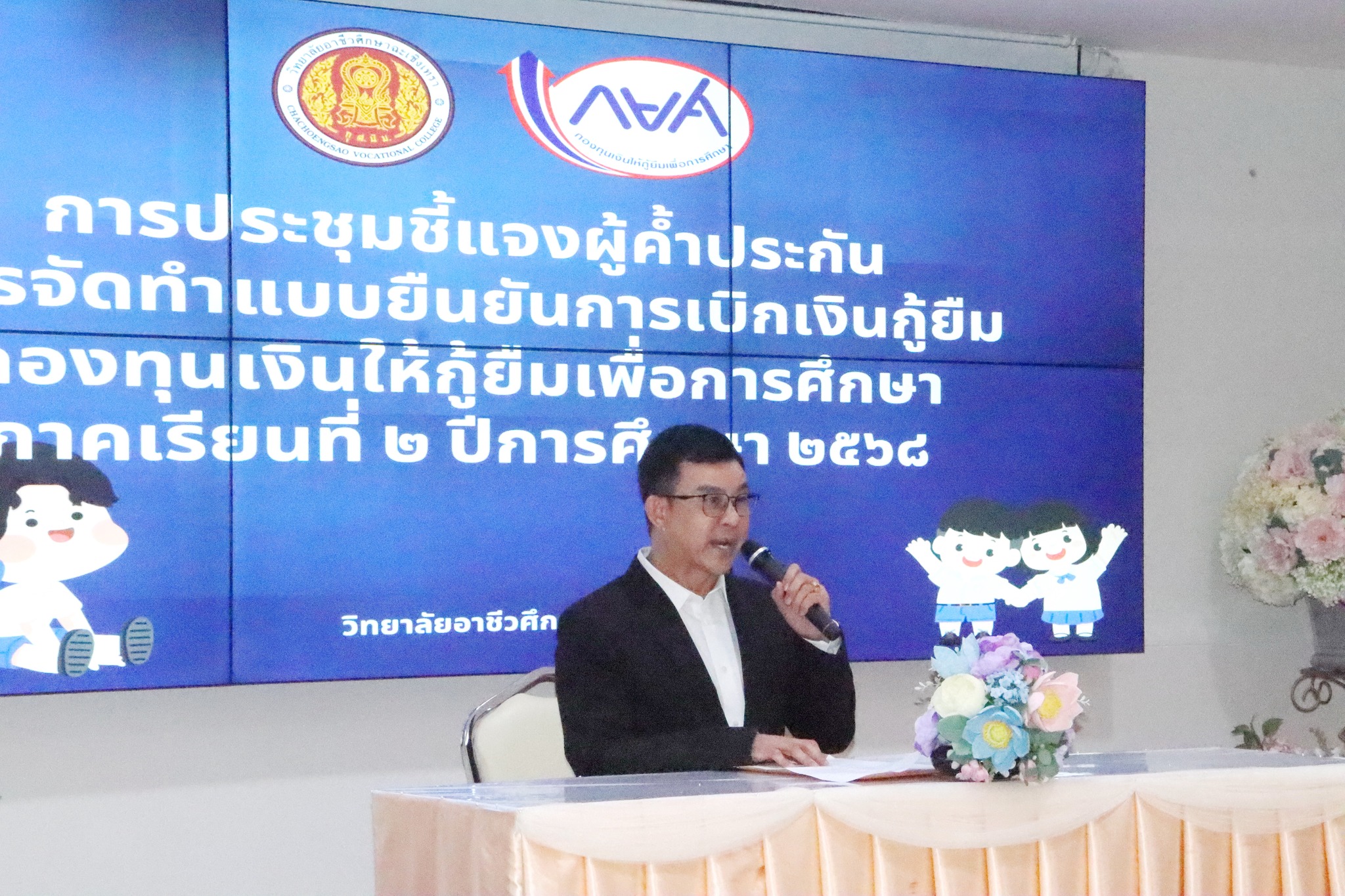 ดร.สุพจน์ ทองเหลือง ผู้อำนวยการ (วิทยฐานะเชี่ยวชาญ) วิทยาลัยอาชีวศึกษาฉะเชิงเทรา พร้อมด้วยคณะผู้บริหาร ครู และบุคลากรทางการศึกษา ได้จัดการประชุมชี้แจงผู้ค้ำประกัน และจัดทำแบบยืนยันการเบิกเงินกู้ยืมกองทุนเงินให้กู้ยืมเพื่อการศึกษา ภาคเรียนที่ ๒ ปีการศึกษา ๒๕๖๘
