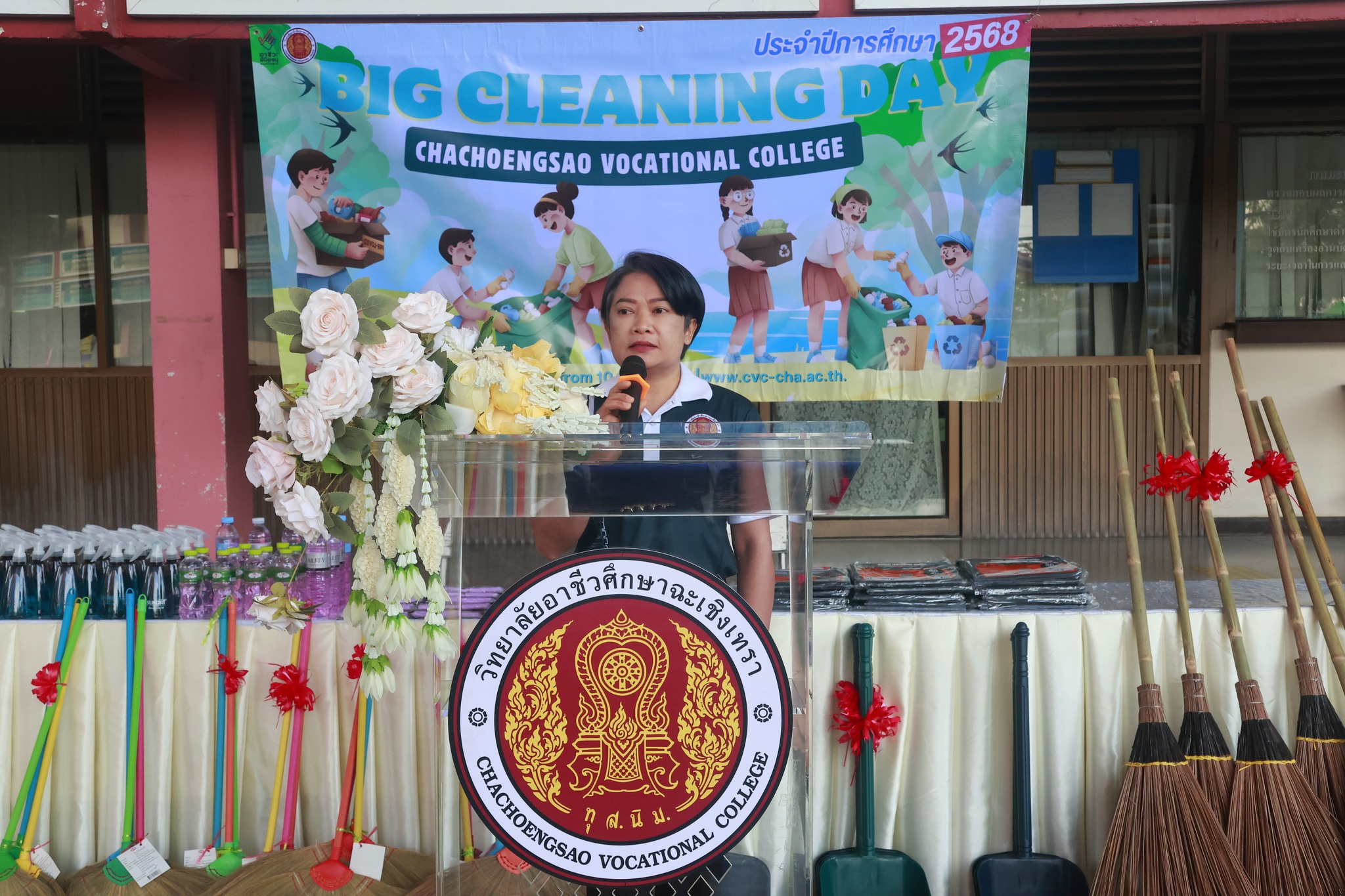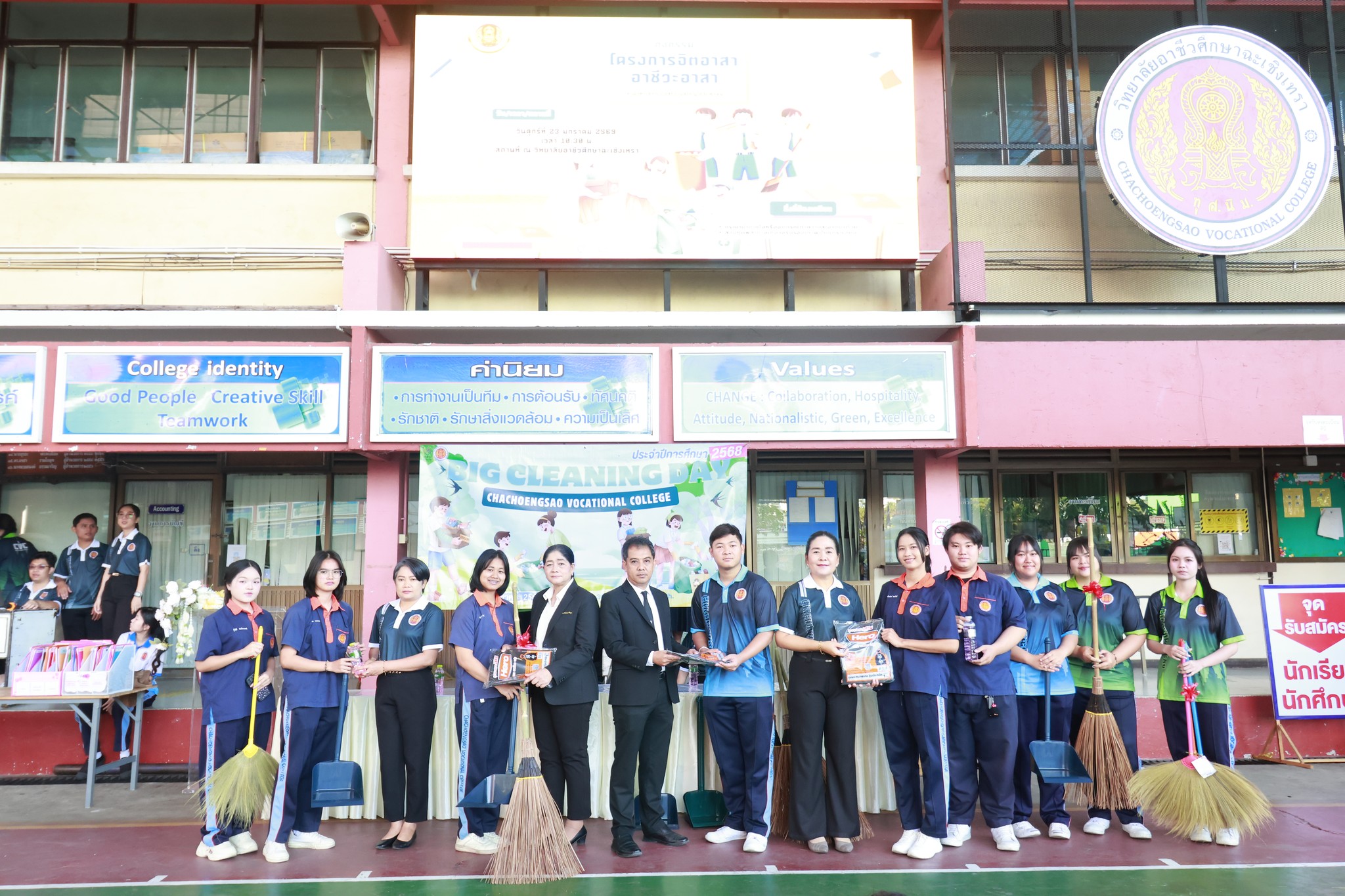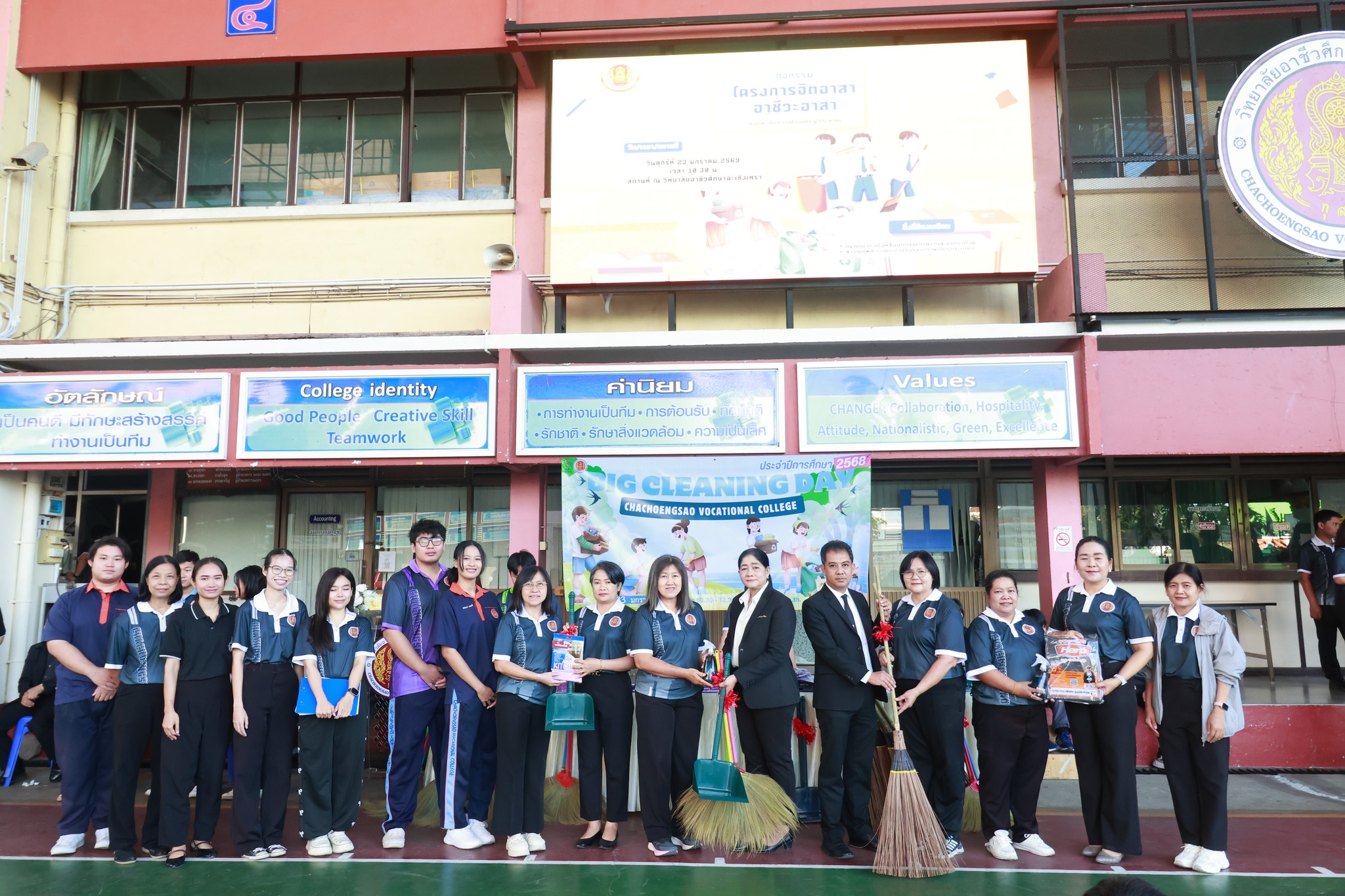 ดร.สุพจน์ ทองเหลือง ผู้อำนวยการ (วิทยฐานะเชี่ยวชาญ) วิทยาลัยอาชีวศึกษาฉะเชิงเทรา มอบหมายให้ นางสาวจารุวรรณ กลีบเมฆ รองผู้อำนวยการฝ่ายบริหารทรัพยากร เป็นประธานในพิธีเปิด โครงการ Big Cleaning Day ประจำปีการศึกษา ๒๕๖๘ โดยมีคณะผู้บริหาร คณะครู บุคลากรทางการศึกษา และนักเรียน นักศึกษา