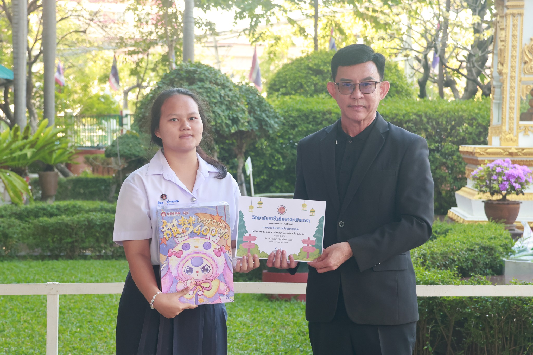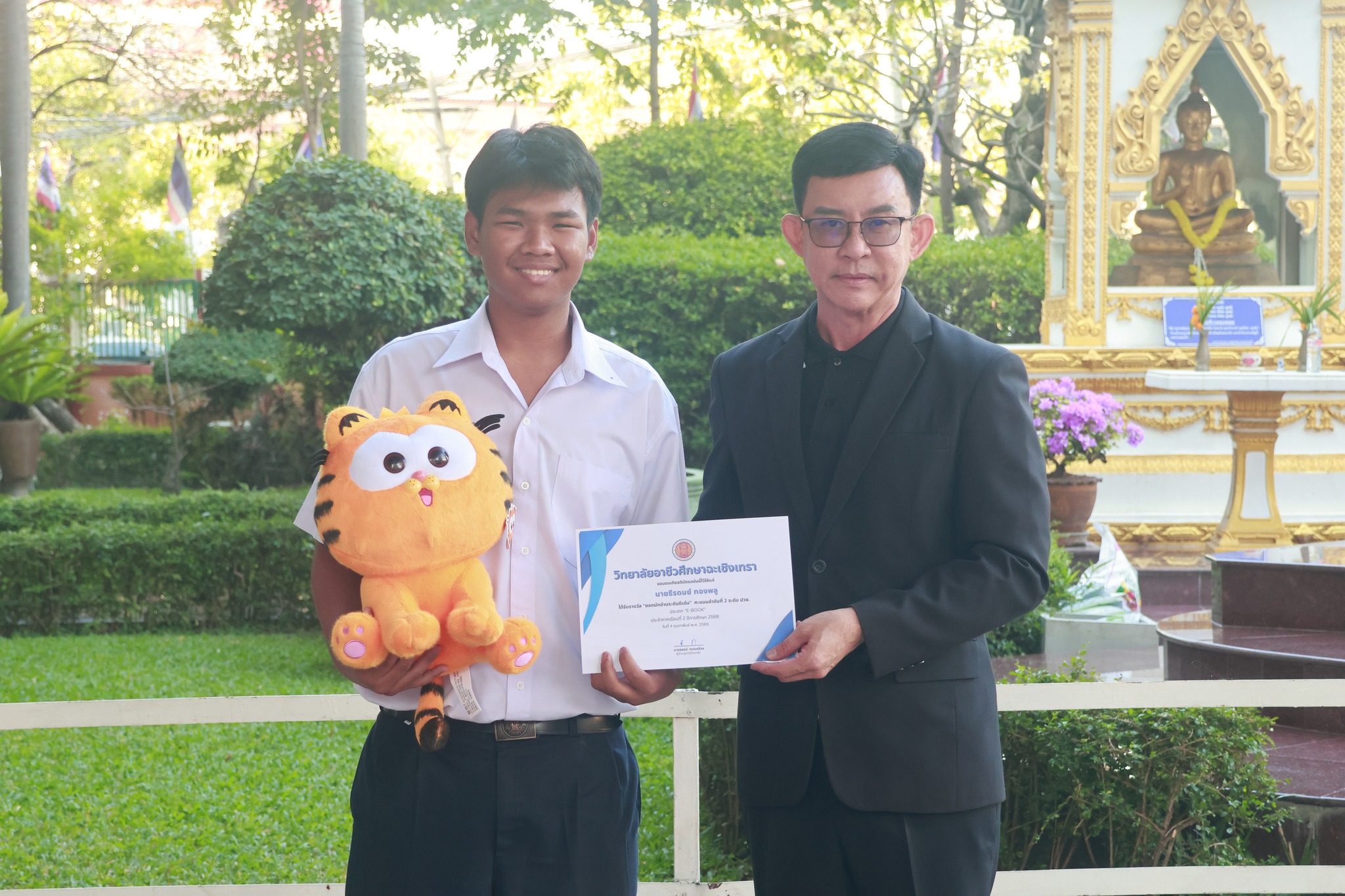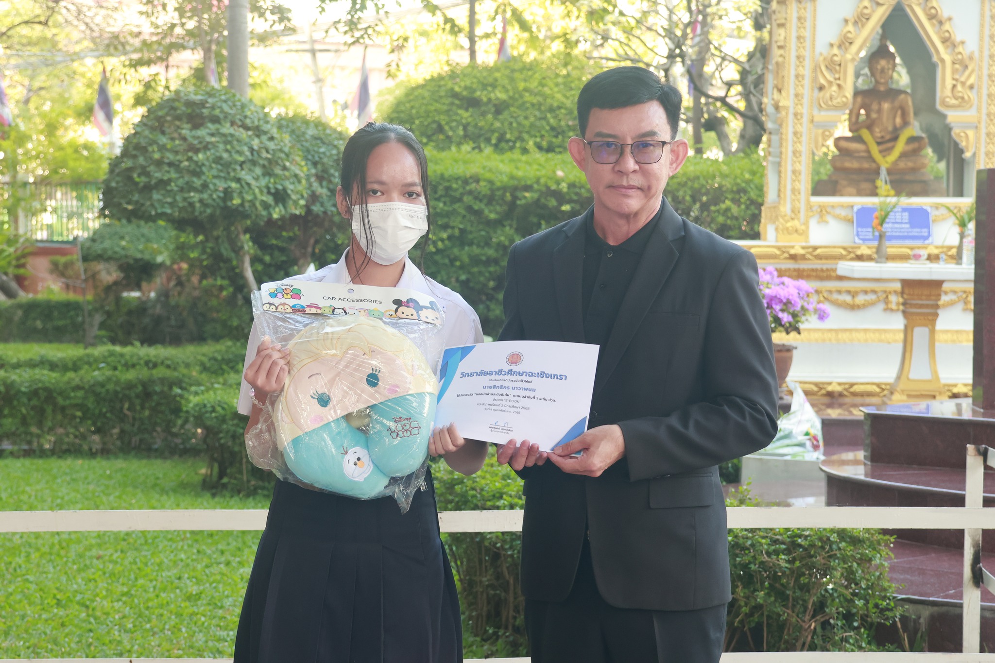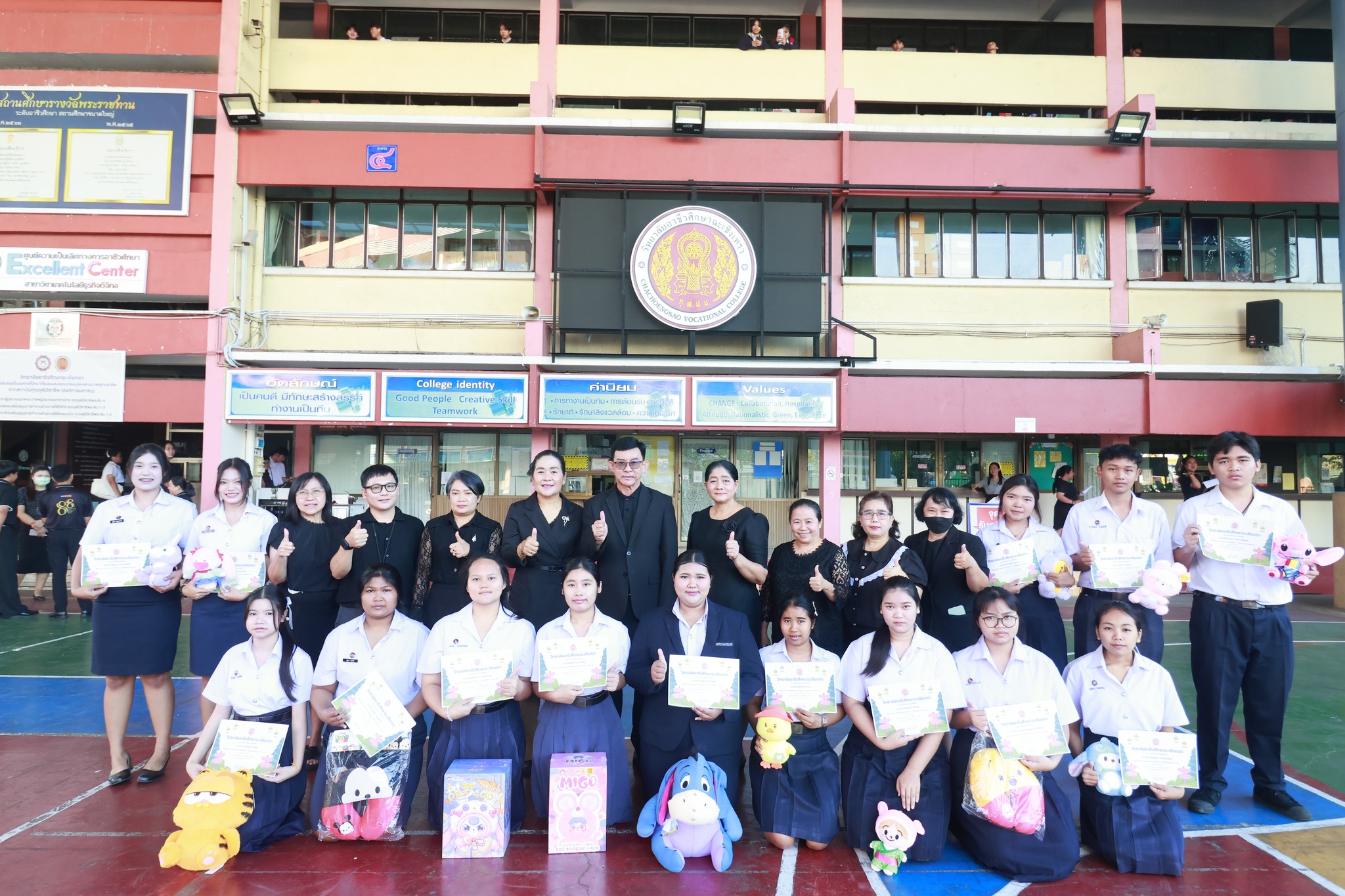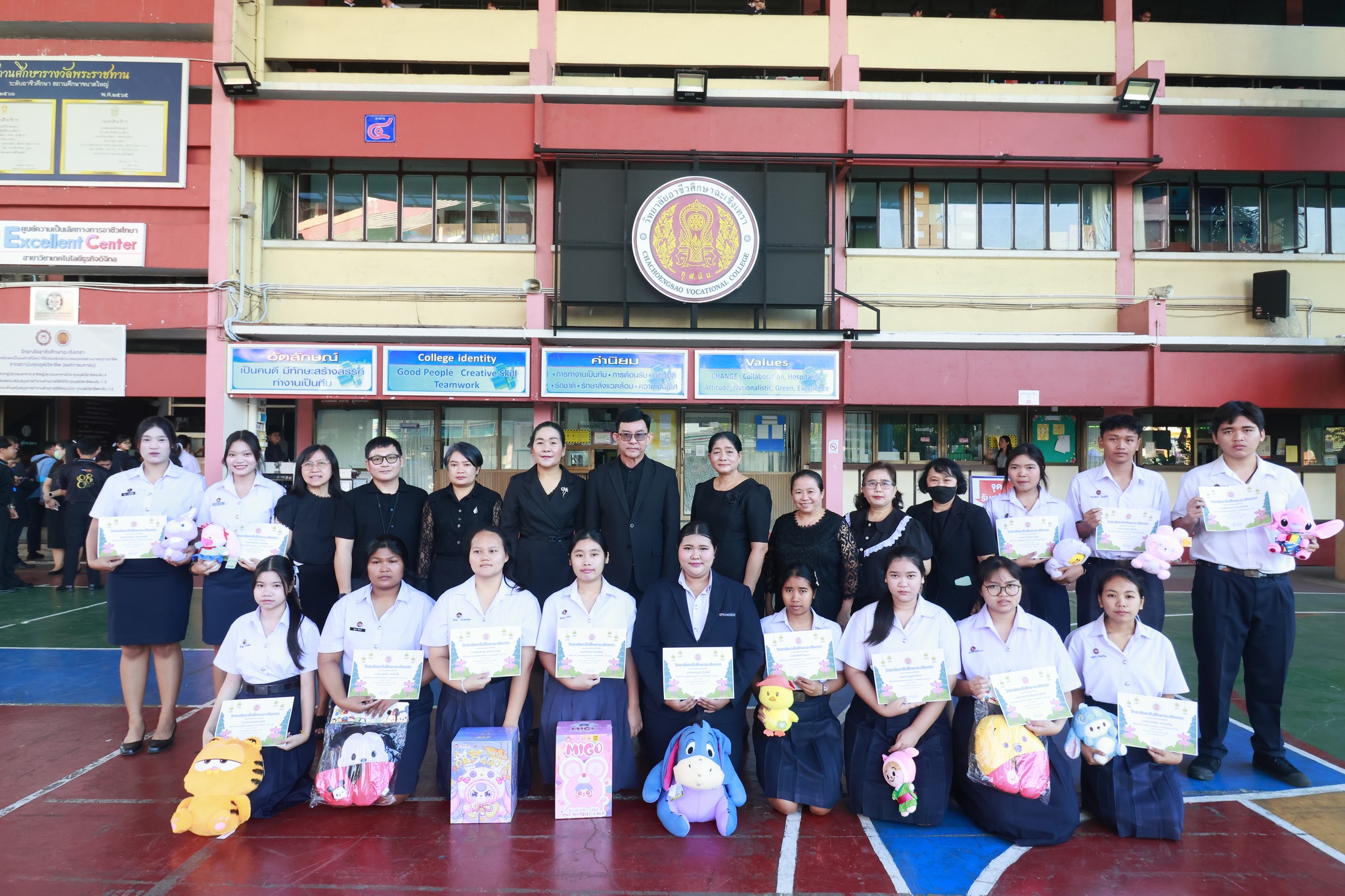 ดร.สุพจน์ ทองเหลือง ผู้อำนวยการ (วิทยฐานะเชี่ยวชาญ) วิทยาลัยอาชีวศึกษาฉะเชิงเทรา มอบเกียรติบัตรและของรางวัล พร้อมทั้งกล่าวแสดงความยินดี กับ นักเรียน นักศึกษา