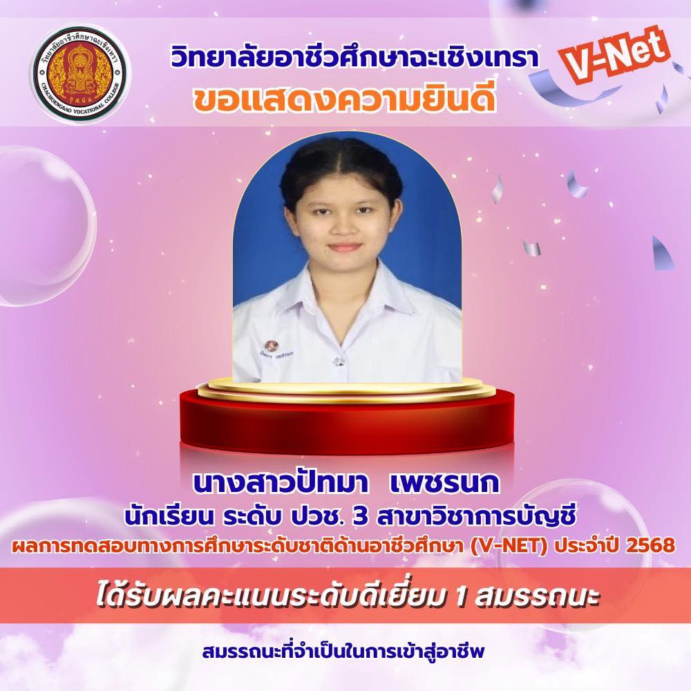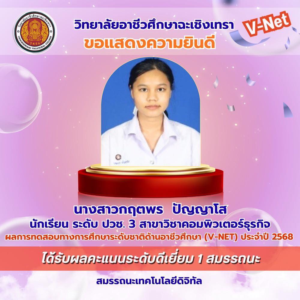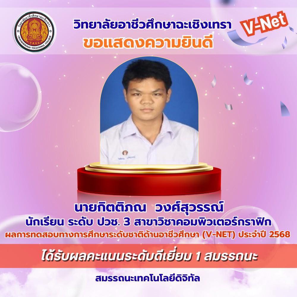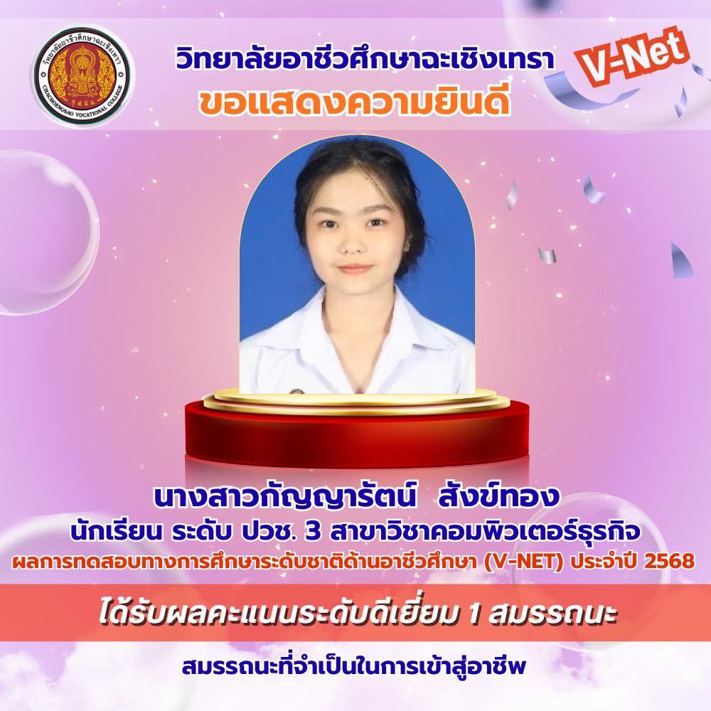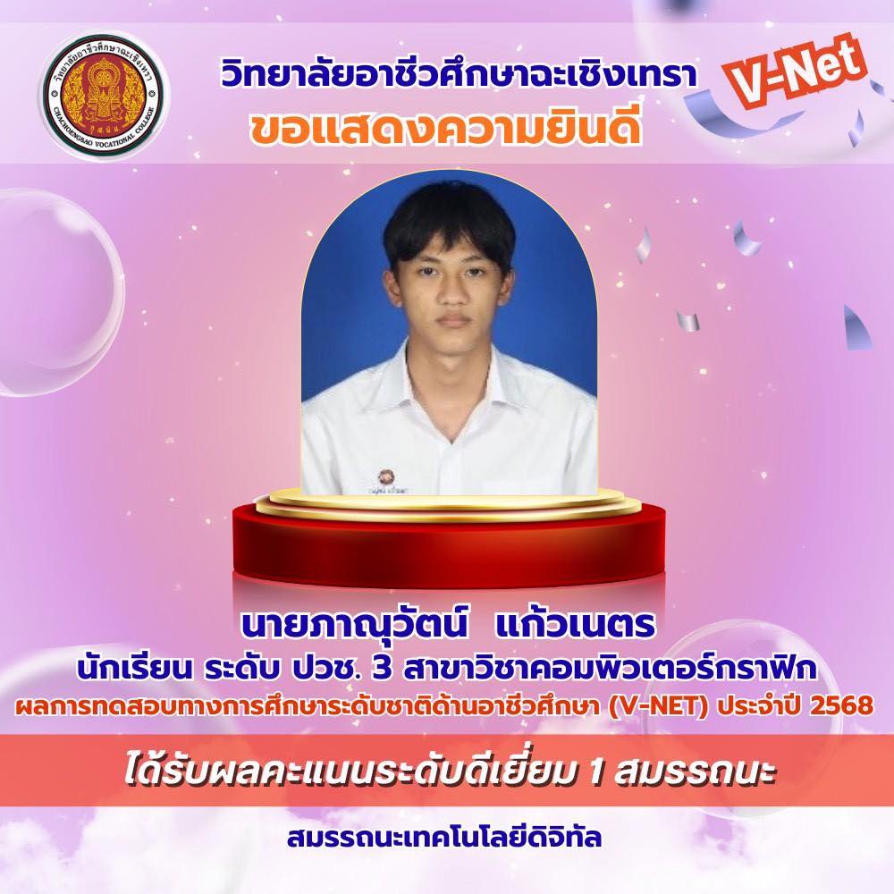 วิทยาลัยอาชีวศึกษาฉะเชิงเทรา ขอแสดงความยินดีกับนักเรียนระดับชั้นประกาศนียบัตรวิชาชีพ (ปวช.) ชั้นปีที่ ๓ ที่มีผลการทดสอบทางการศึกษาระดับชาติด้านอาชีวศึกษา (V-Net) ประจำปีการศึกษา ๒๕๖๘ อยู่ในระดับดีเยี่ยม โดยนักเรียนสามารถทำคะแนนได้อย่างโดดเด่นในด้าน สมรรถนะเทคโนโลยีดิจิทัล สมรรถนะที่จำเป็นในการเข้าสู่อาชีพระดับ ปวช. (๑-๘) และสมรรถนะภาษาอังกฤษ
