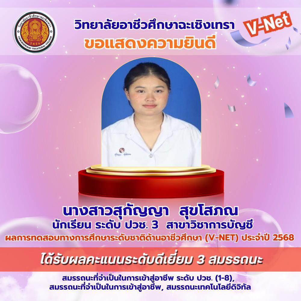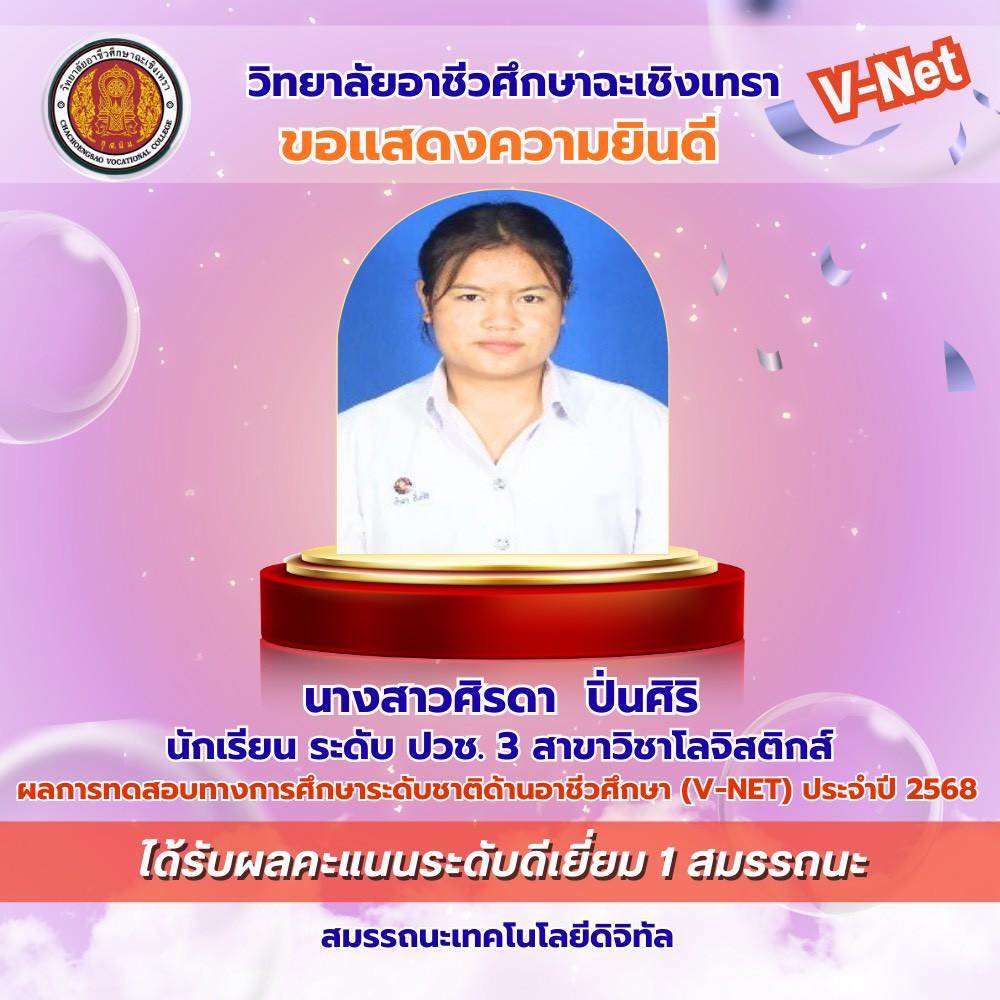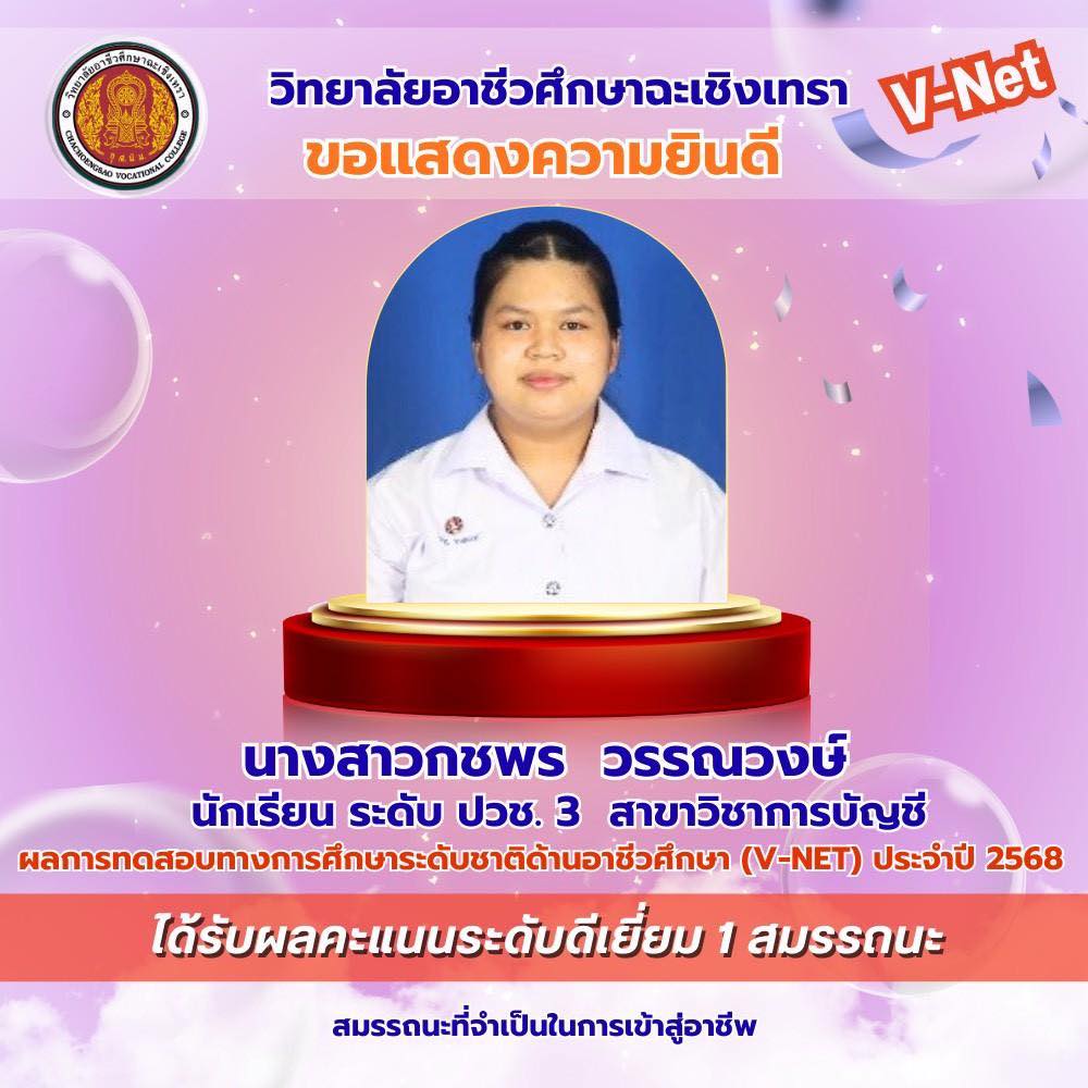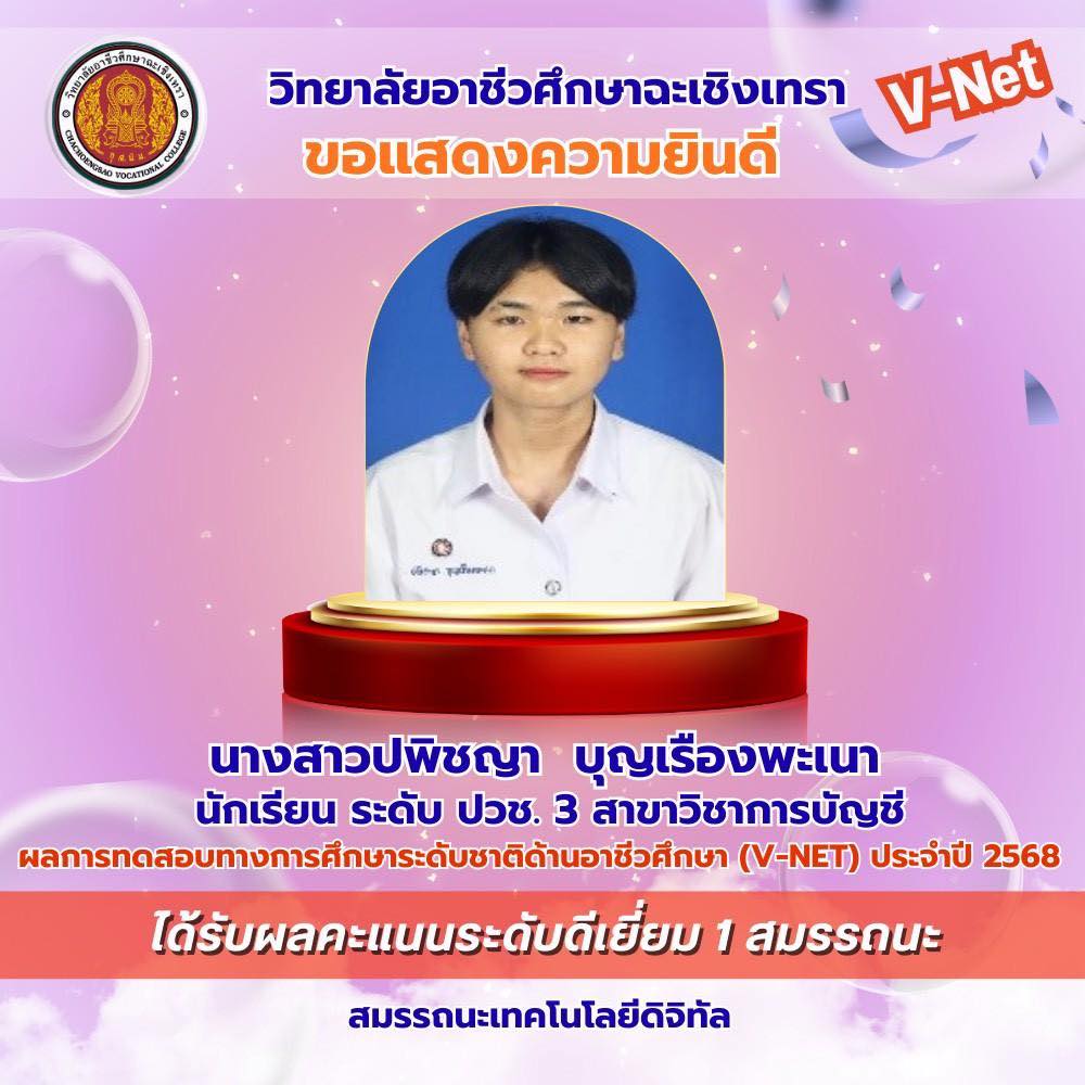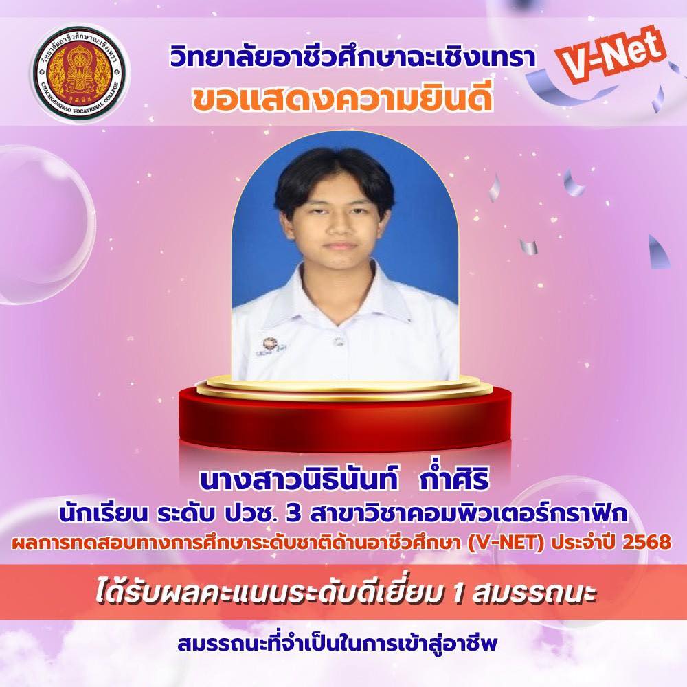 วิทยาลัยอาชีวศึกษาฉะเชิงเทรา ขอแสดงความยินดีกับนักเรียนระดับชั้นประกาศนียบัตรวิชาชีพ (ปวช.) ชั้นปีที่ ๓ ที่มีผลการทดสอบทางการศึกษาระดับชาติด้านอาชีวศึกษา (V-Net) ประจำปีการศึกษา ๒๕๖๘ อยู่ในระดับดีเยี่ยม โดยนักเรียนสามารถทำคะแนนได้อย่างโดดเด่นในด้าน สมรรถนะเทคโนโลยีดิจิทัล สมรรถนะที่จำเป็นในการเข้าสู่อาชีพระดับ ปวช. (๑-๘) และสมรรถนะภาษาอังกฤษ