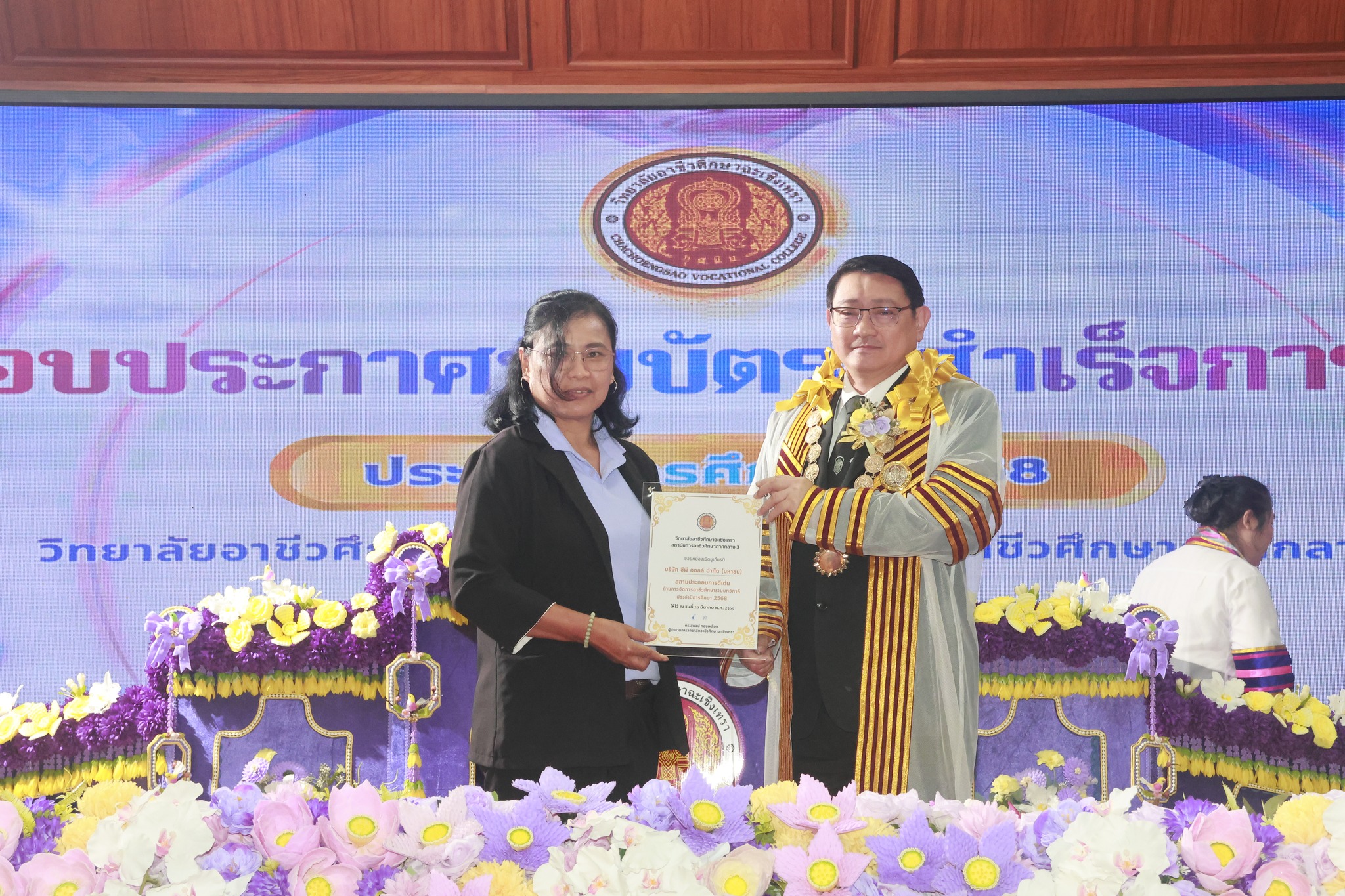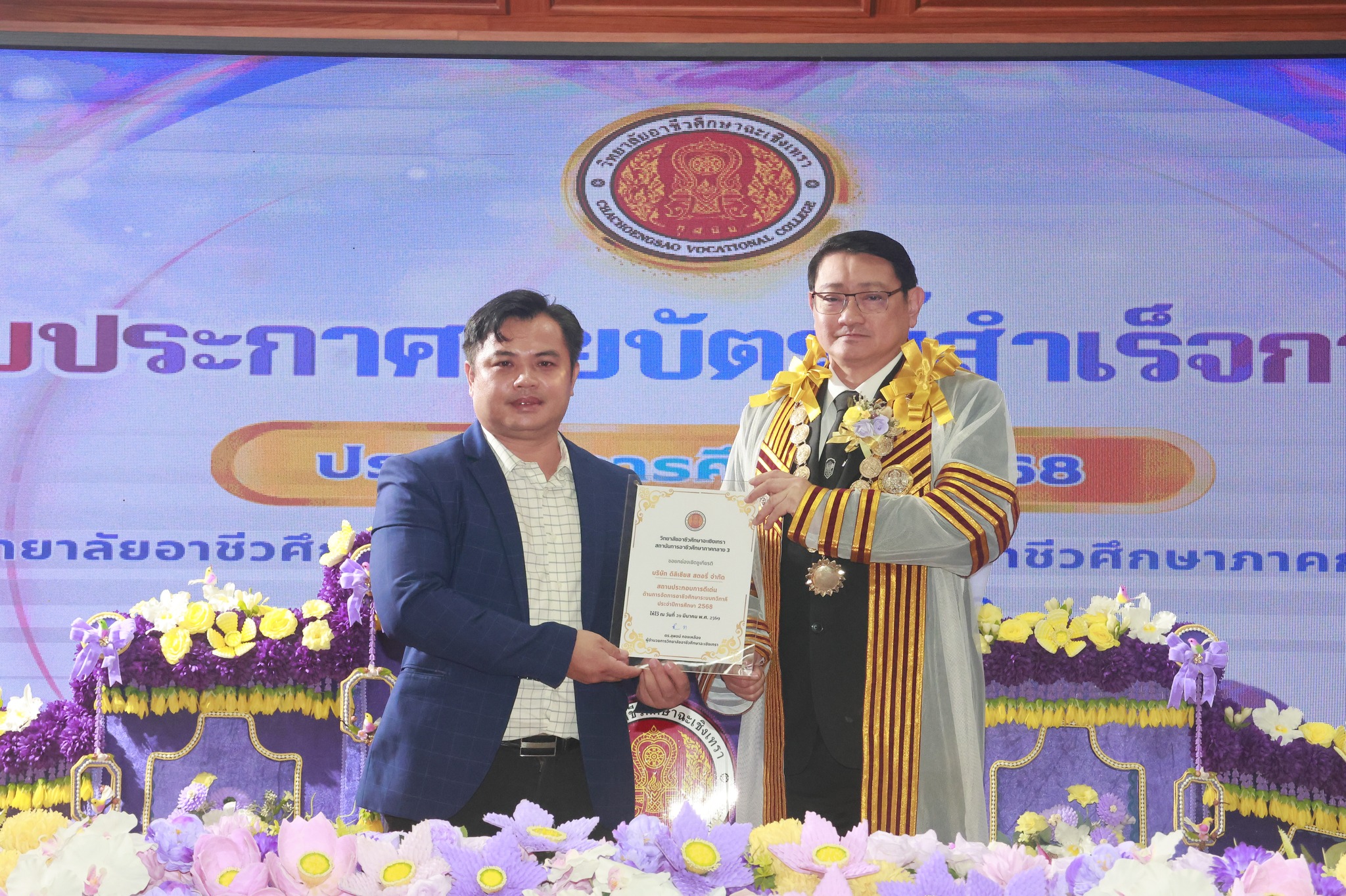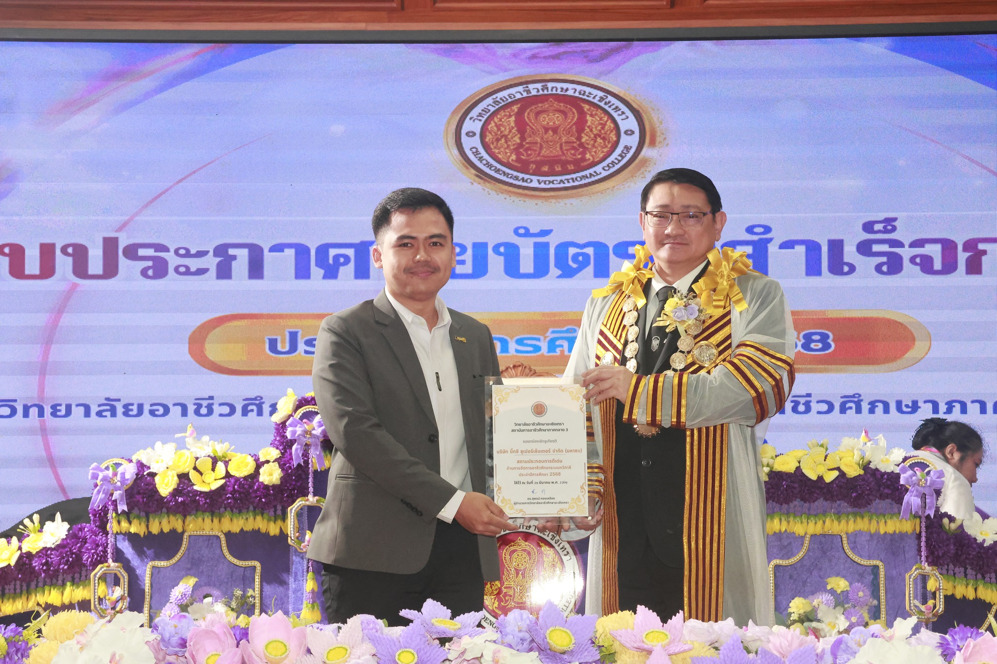 วิทยาลัยอาชีวศึกษาฉะเชิงเทรา นำโดย ดร.สุพจน์ ทองเหลือง (วิทยฐานะเชี่ยวชาญ) ผู้อำนวยการวิทยาลัยอาชีวศึกษาฉะเชิงเทรา พร้อมด้วยคณะผู้บริหาร ข้าราชการครู และบุคลากรทางการศึกษา จัดพิธีมอบประกาศนียบัตร ผู้สำเร็จการศึกษา ประจำปีการศึกษา ๒๕๖๘ ในวันที่ ๒๙ มีนาคม ๒๕๖๙ ณ วิทยาลัยเทคนิคฉะเชิงเทรา
