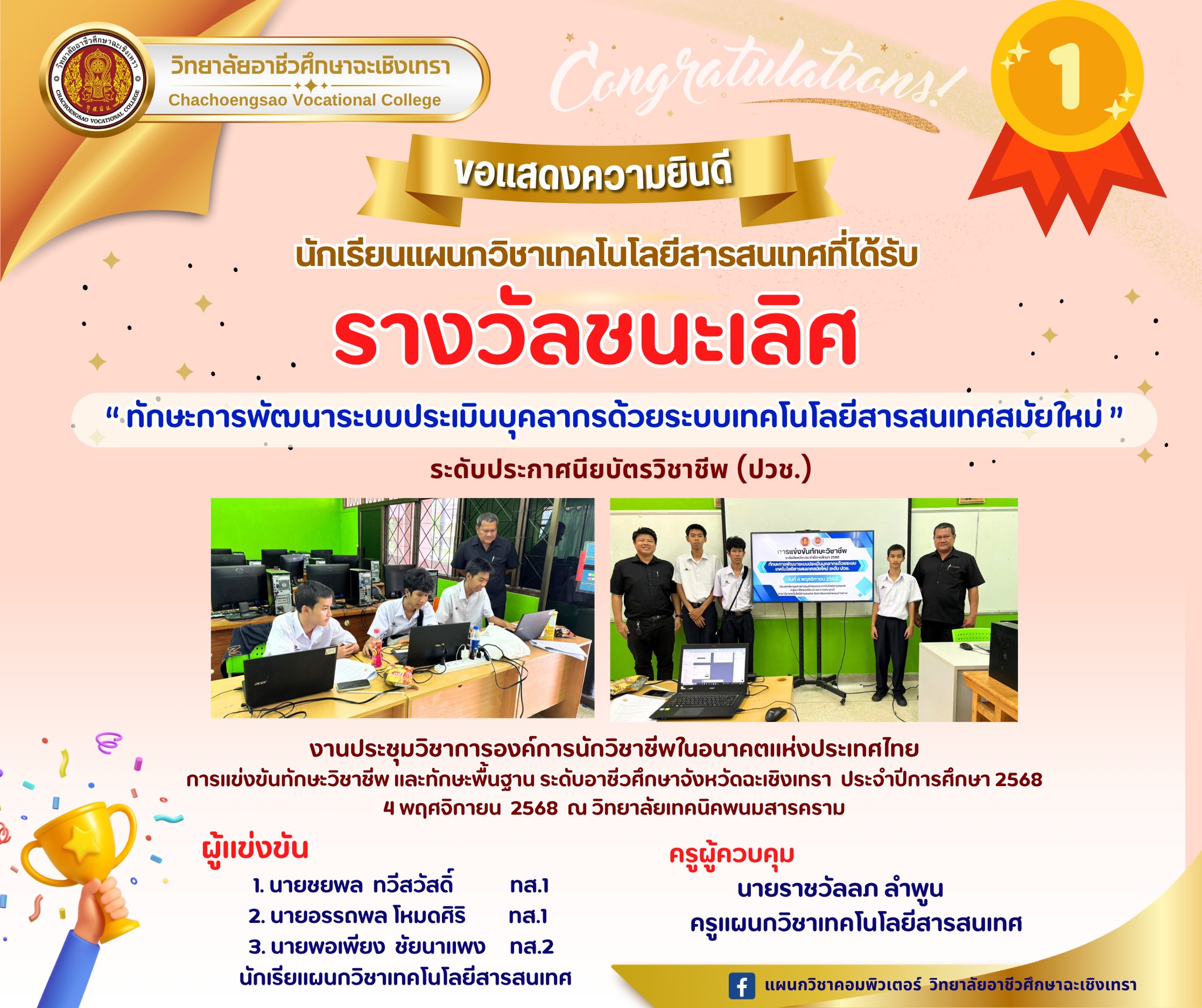 ได้รับรางวัล ชนะเลิศ การประกวดแข่งขันทักษะวิชาชีพและทักษะพื้นฐาน" ระดับอาชีวศึกษาจังหวัดฉะเชิงเทรา ประจำปีการศึกษา ๒๕๖๘
