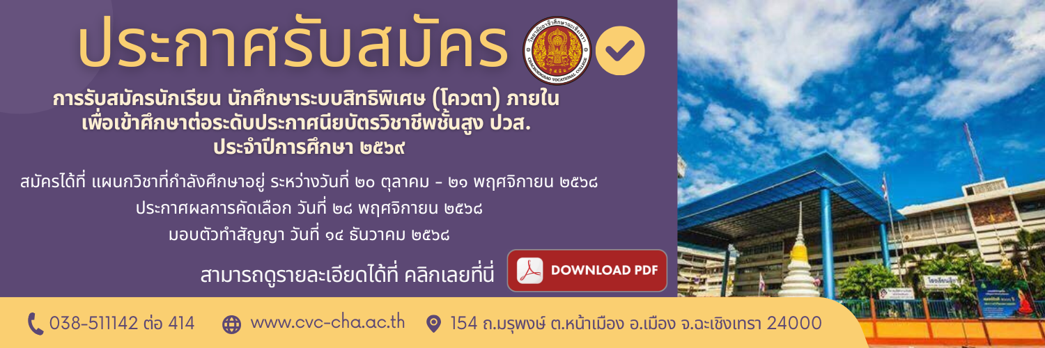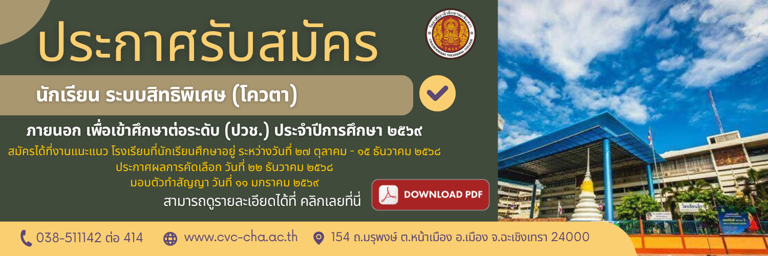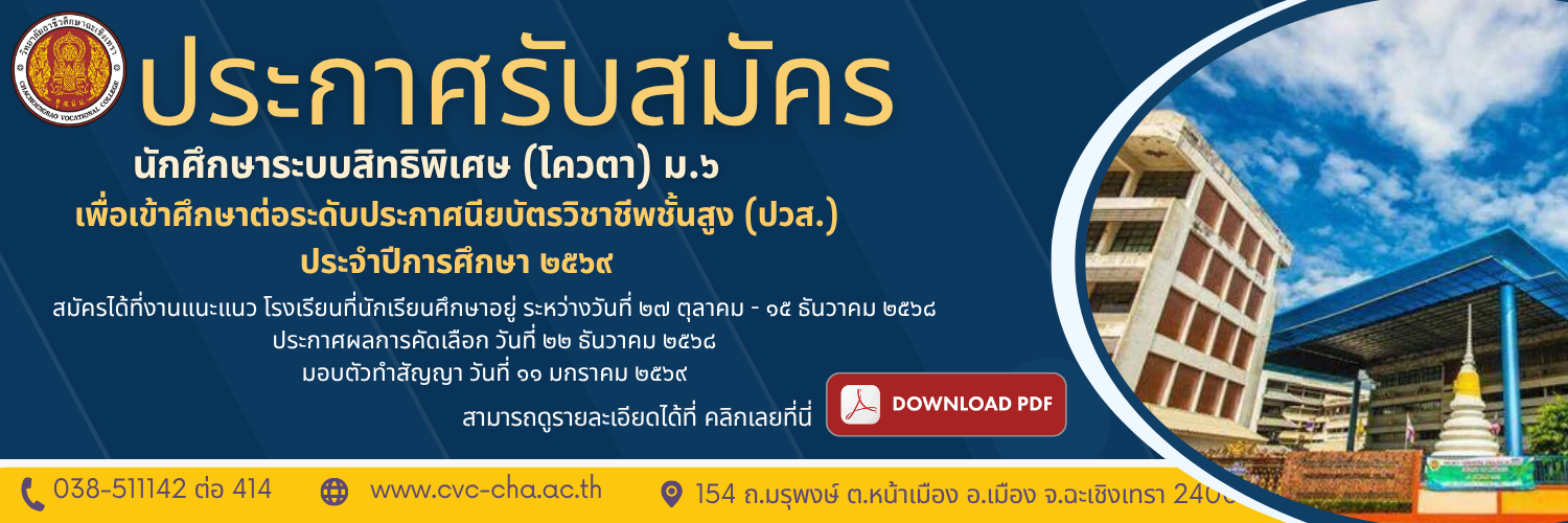 ดร.สุพจน์ ทองเหลือง ผู้อำนวยการวิทยาลัยอาชีวศึกษาฉะเชิงเทรา มอบหมายให้ คณะผู้บริหาร ข้าราชการครู บุคลากรทางการศึกษา นักเรียน นักศึกษา และทีมงานแนะแนวอาชีพ