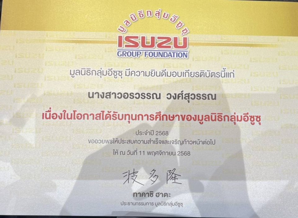 ดร.สุพจน์ ทองเหลือง ผู้อำนวยการ (วิทยฐานะเชี่ยวชาญ) วิทยาลัยอาชีวศึกษาฉะเชิงเทรา มอบหมายให้งานแนะแนวฯ นำนักเรียนเข้าร่วมพิธีมอบทุนการศึกษา จากมูลนิธิกลุ่มอีซูซุ ประจำปีการศึกษา 2568 ณ บริษัทตรีเพชรอีซูซุ จำกัด เมื่อวันที่ 11 พฤศจิกายน 2568