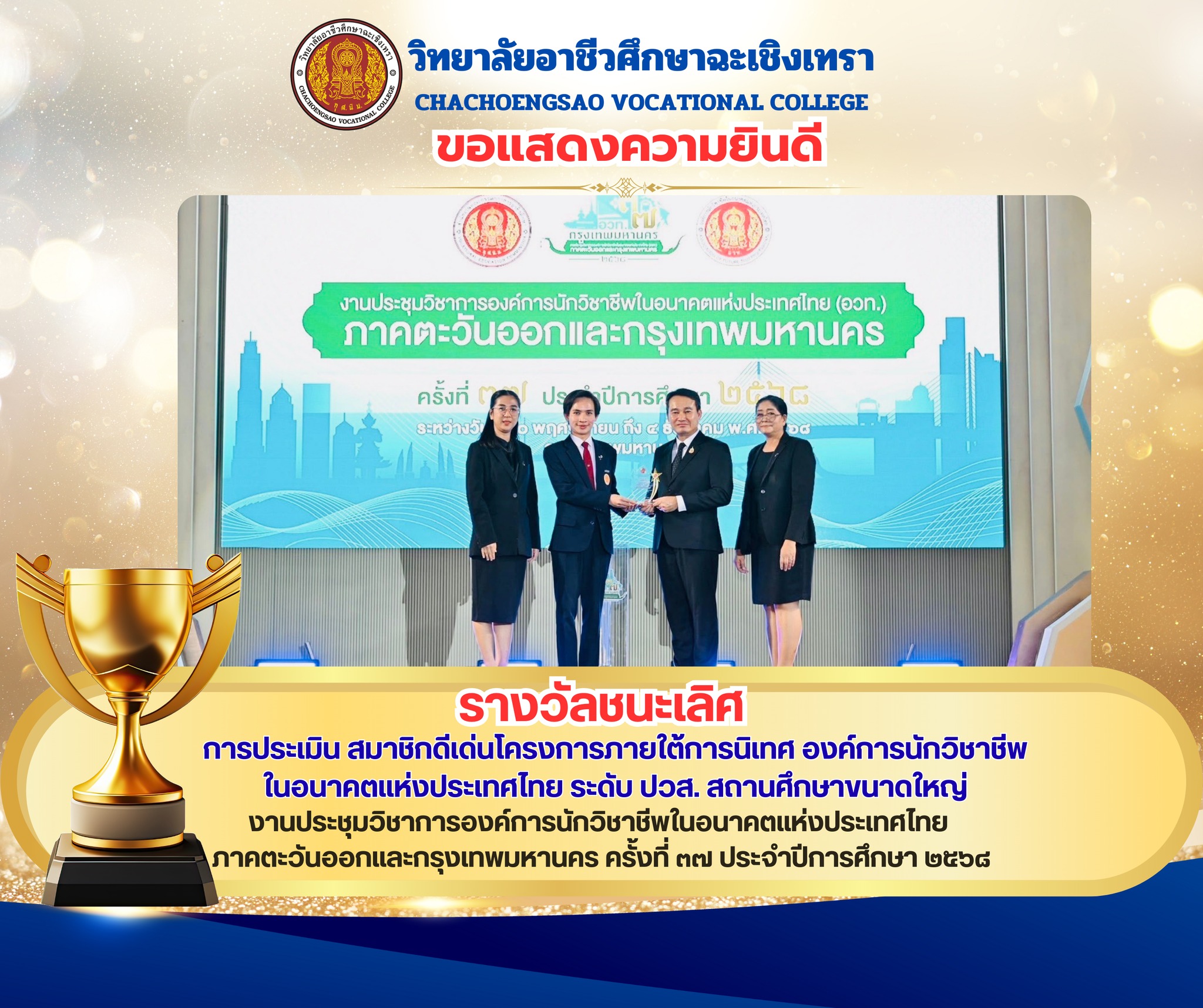 ได้รับรางวัล ชนะเลิศ การประเมิน สมาชิกดีเด่นโครงการภายใต้การนิเทศ องค์การนักวิชาชีพในอนาคตแห่งประเทศไทย ระดับ ปวส. สถานศึกษาขนาดใหญ่