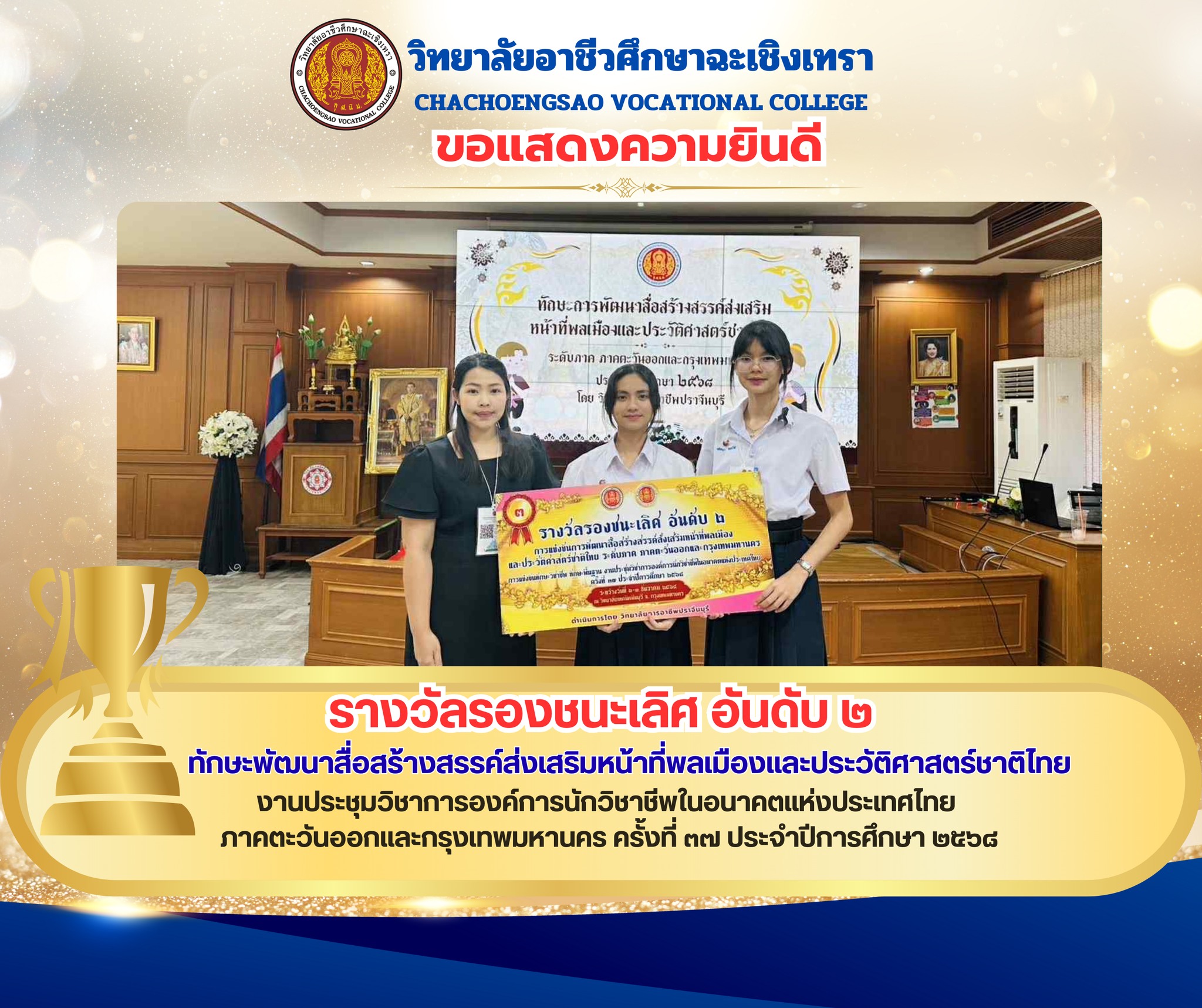 ได้รับรางวัล ชนะเลิศ การประเมิน สมาชิกดีเด่นโครงการภายใต้การนิเทศ องค์การนักวิชาชีพในอนาคตแห่งประเทศไทย ระดับ ปวส. สถานศึกษาขนาดใหญ่